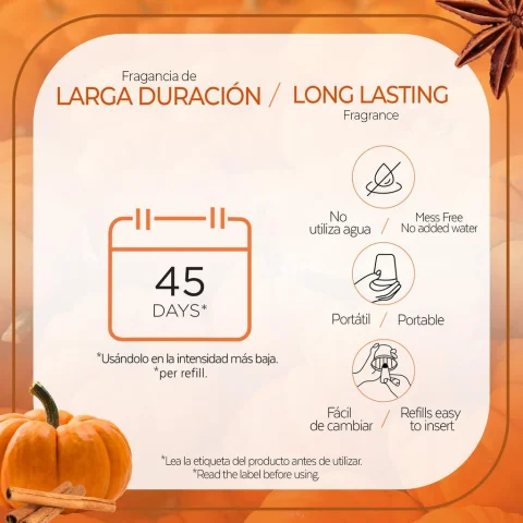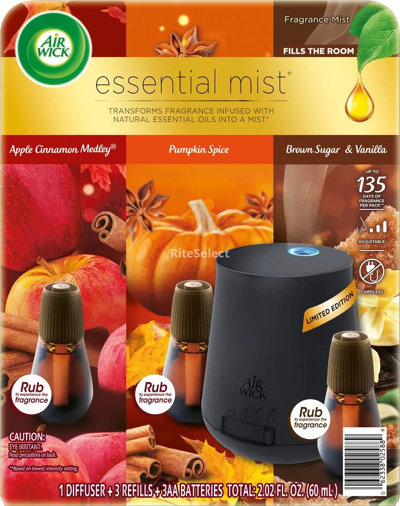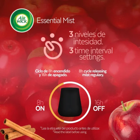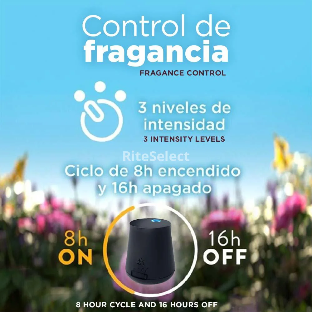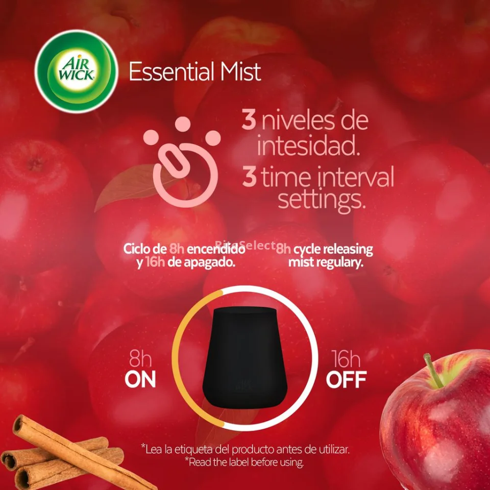 The Air Wick Essential Mist® diffuser fills any room with a soft, aromatic mist infused with natural essential oils. With recharges lasting up to 135 days and adjustable frequency settings. Create special moments at home! Because of its practical size and battery operation, take it anywhere in your home. Controls the fragrance up to 3 levels of intensity in terms of frequency and time of vapor emission. This item comes in assorted fragrances, select and purchase your favorite.
