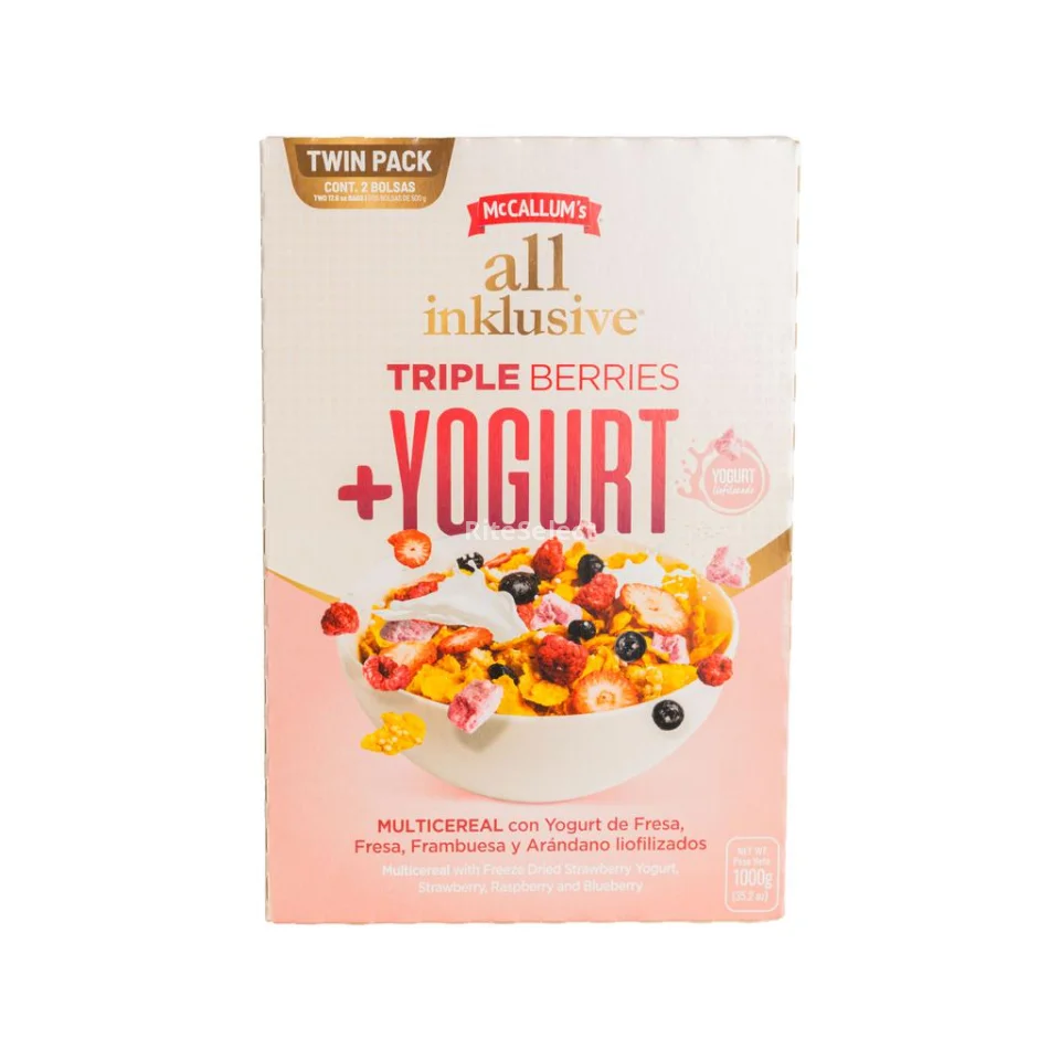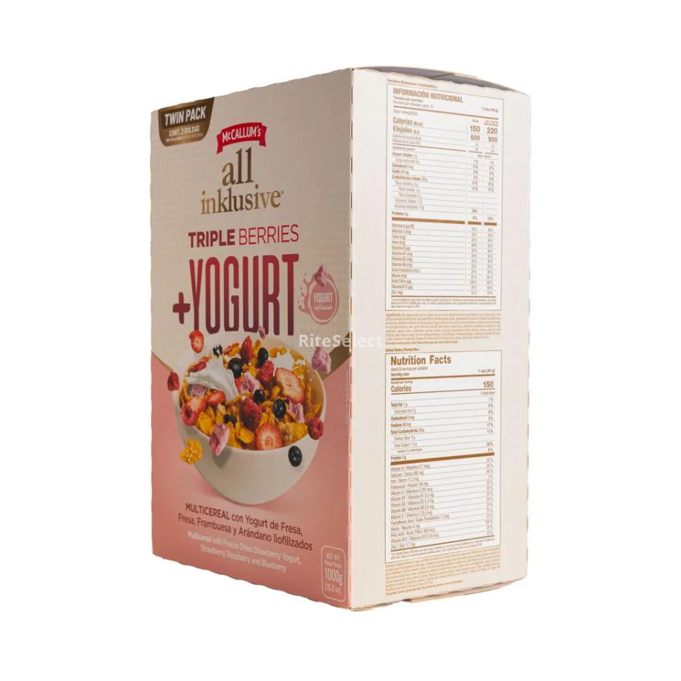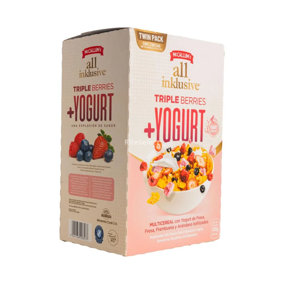 This product consists of two cereal units, 500 g each, made with strawberries, raspberries and freeze-dried cranberries, accompanied by strawberry yogurt. Main ingredients are cereal grains, freeze-dried berries (strawberries, raspberries and cranberries) and strawberry yogurt, providing a balanced combination of carbohydrates, fiber, protein and natural antioxidants from fruits.