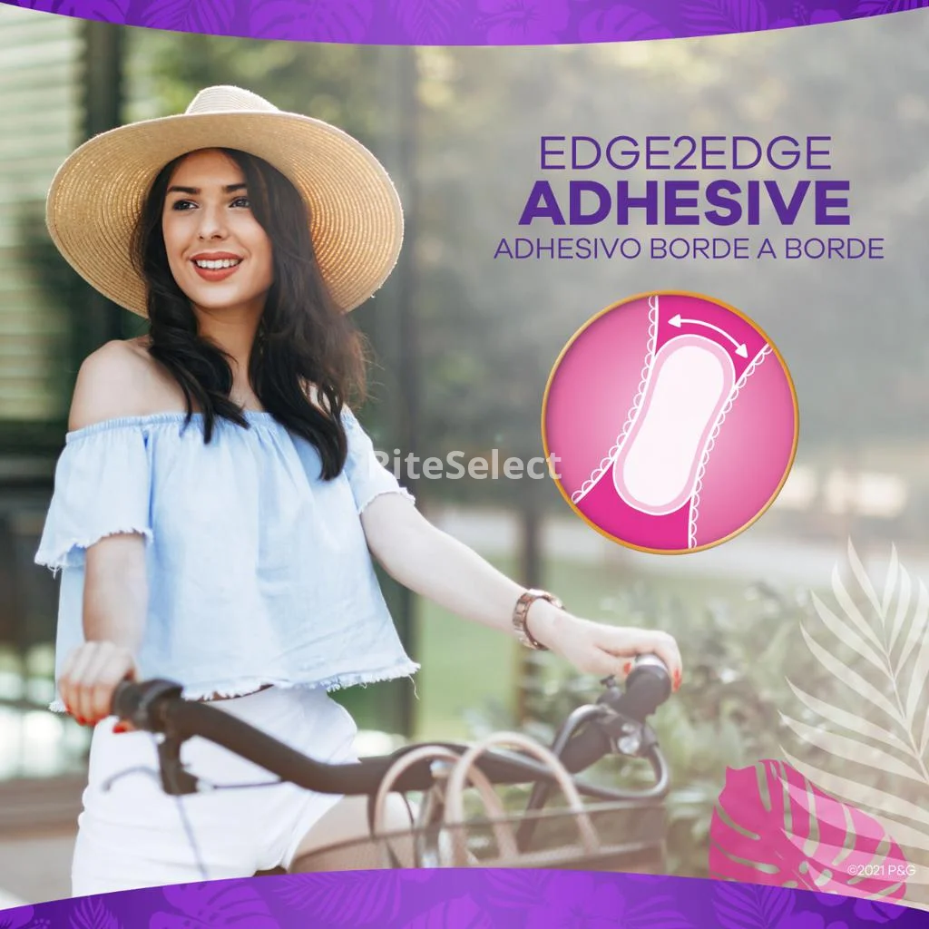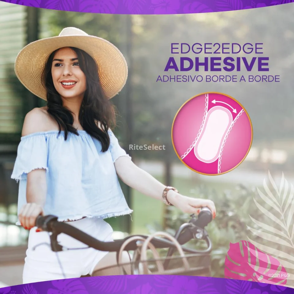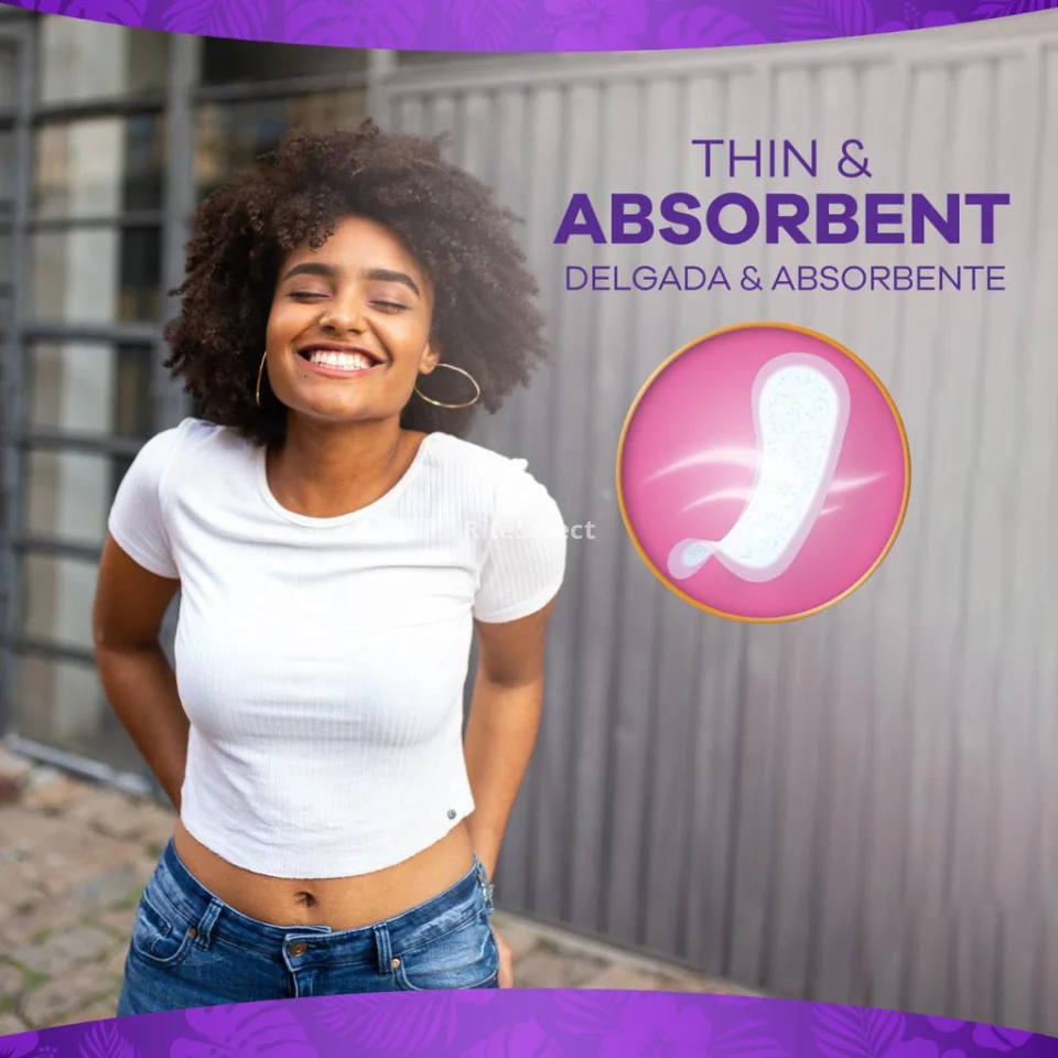 Flexible protection for everyday comfort | Breathable layers help keep moisture away | Edge to edge adhesive | Fresh and clean scent | Ideal for a daily clean feeling, light flow days, tampon backing.