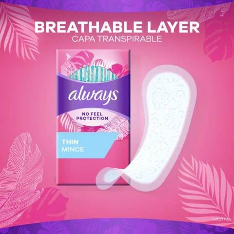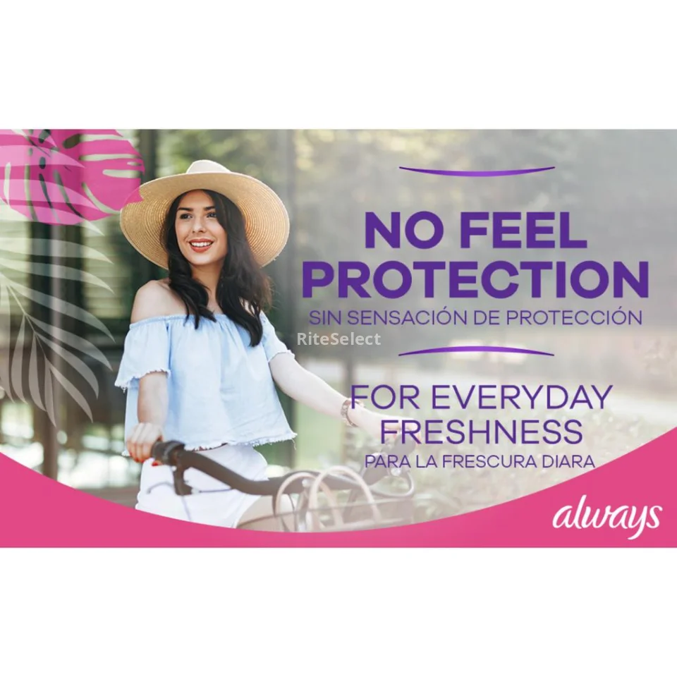 For light days or as a backup for period leakage, discover Always Thin No Feel Protection Daily Liners Regular for discreet protection against daily flow and odors. These liners are made to be thin and absorbent for daily freshness. Plus, the Edge-2-Edge adhesive helps keep the pad in place. For convenient on-the-go protection, they come individually wrapped, so you can take them anywhere. Get daily protection against flow and odors so discreet you won't even know it's there.