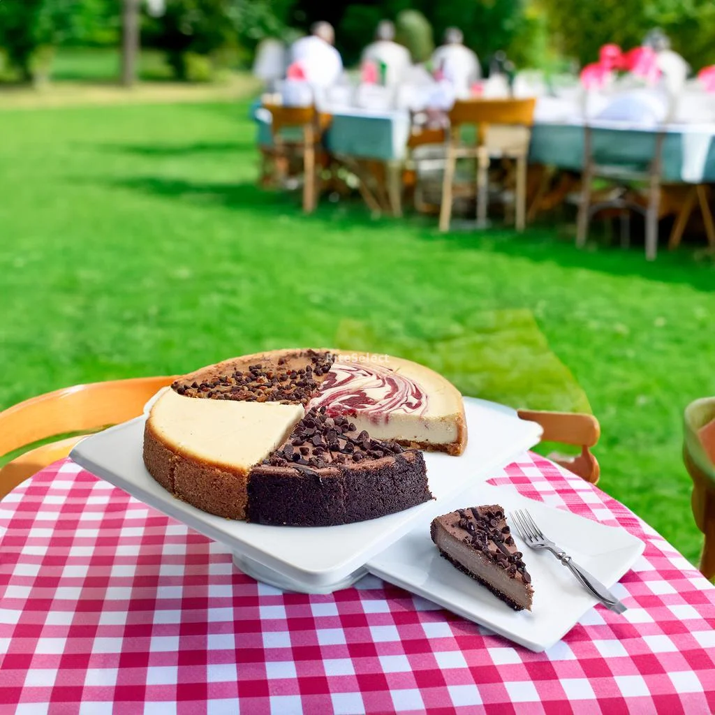 • Cheescake decorated with 4 different flavors: New York or Traditional style, Chocolate, Caramel and Strawberry Jelly.
