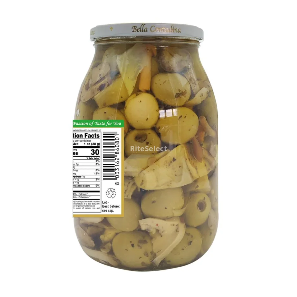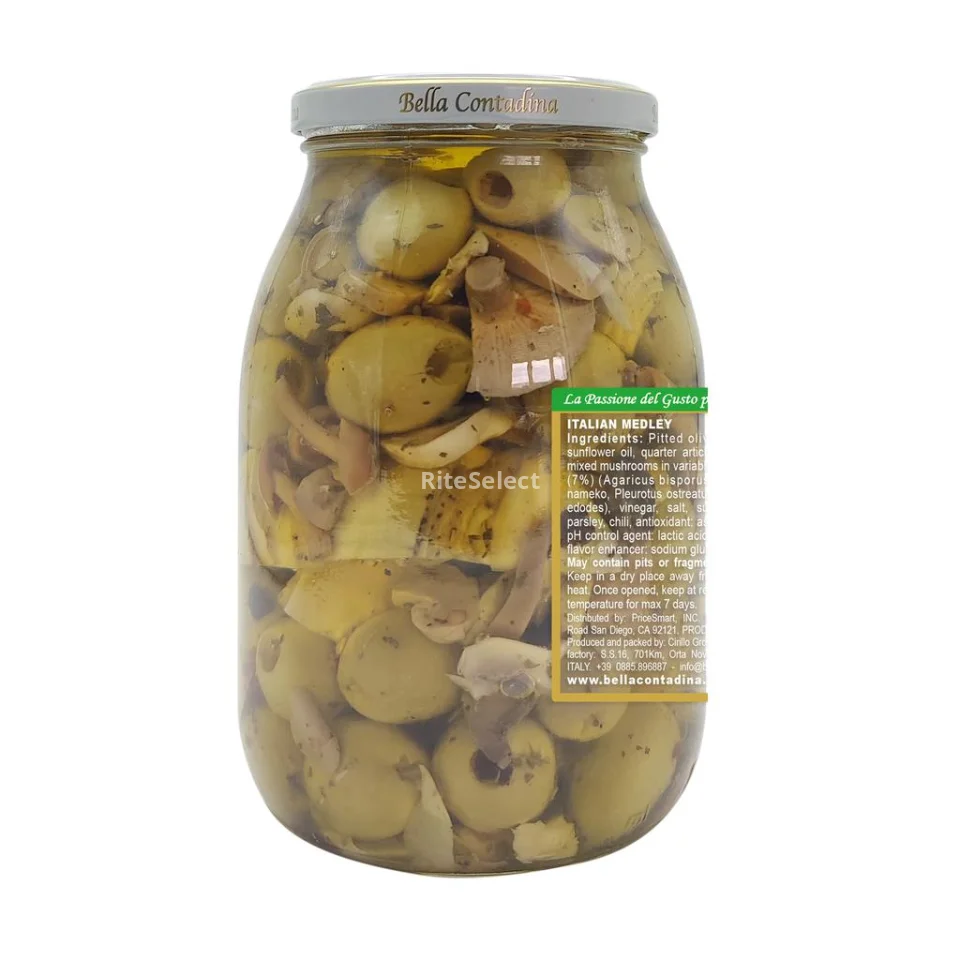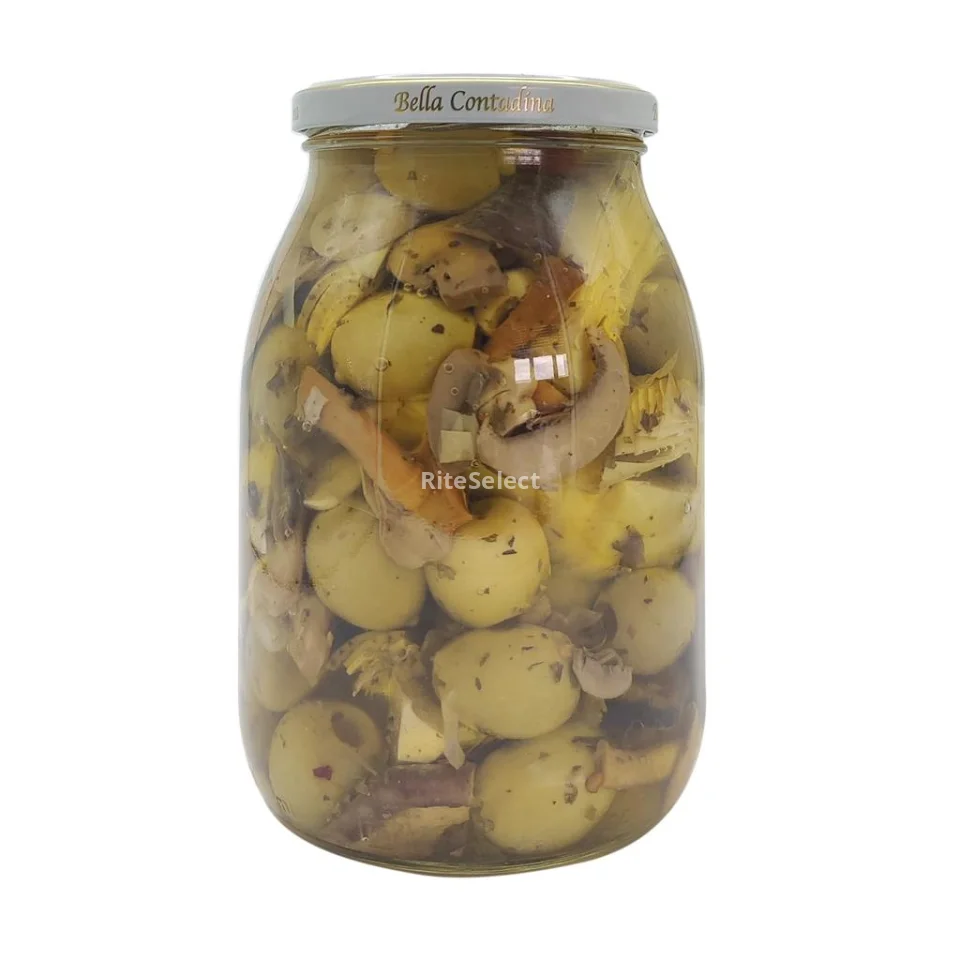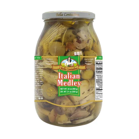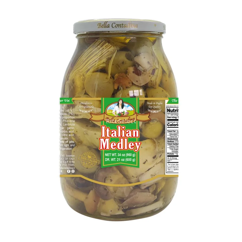 Bella Contadina's Capricciosa Italiana, an exquisite combination of boneless olives and a selection of vegetables dressed in sunflower oil, captures the essence of the traditional cuisine of Puglia, Italy. Made with 48% carefully selected olives, artichoke hearts, mixed mushrooms and a touch of garlic, parsley and chili, this mix offers a perfect balance of intense and fresh flavors that enhance any dish or appetizer. The dressing, enriched with vinegar and natural spices, highlights the nuances of each ingredient, providing a unique sensory experience.