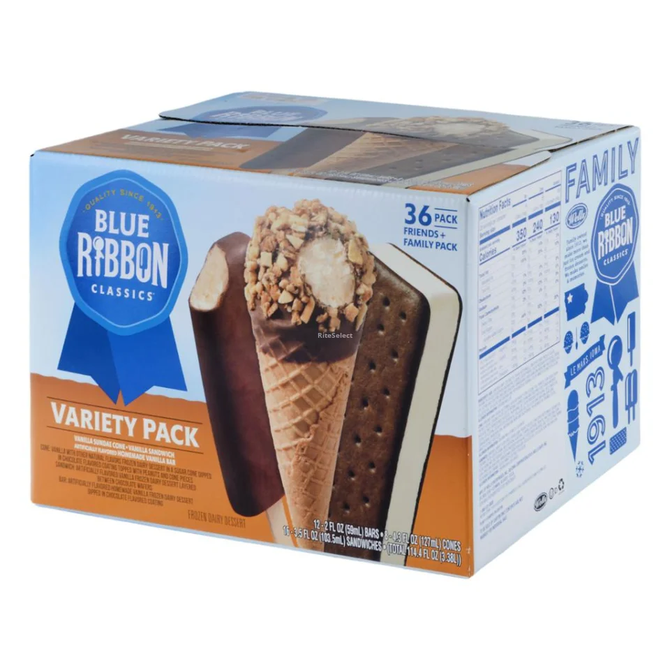 Make every moment special with Blue Ribbon Assorted Shape Ice Cream Packs. Whether it's a sunny day or a cozy evening, our 36 ice creams provide the variety you need for you and yours. Keep refrigerated, artificial flavors added.