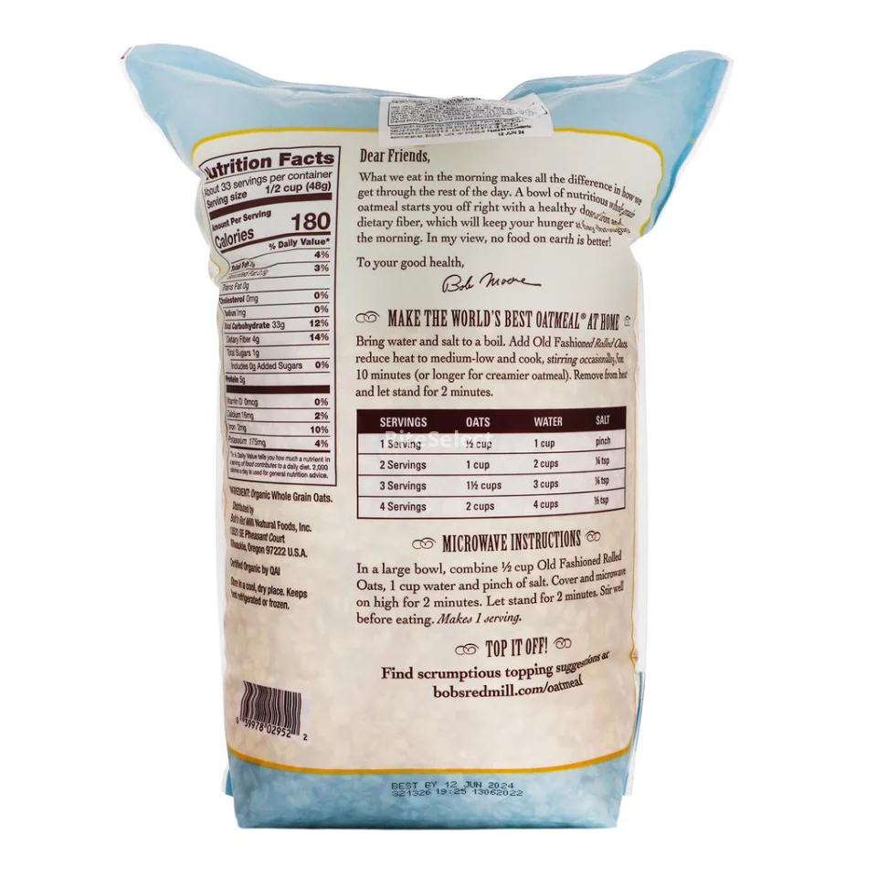 USDA Organic. Old fashioned. Whole grain. Commitment to non-GMO sources. 5 g protein per serving | Ready to eat | Store in a cool and dry place.