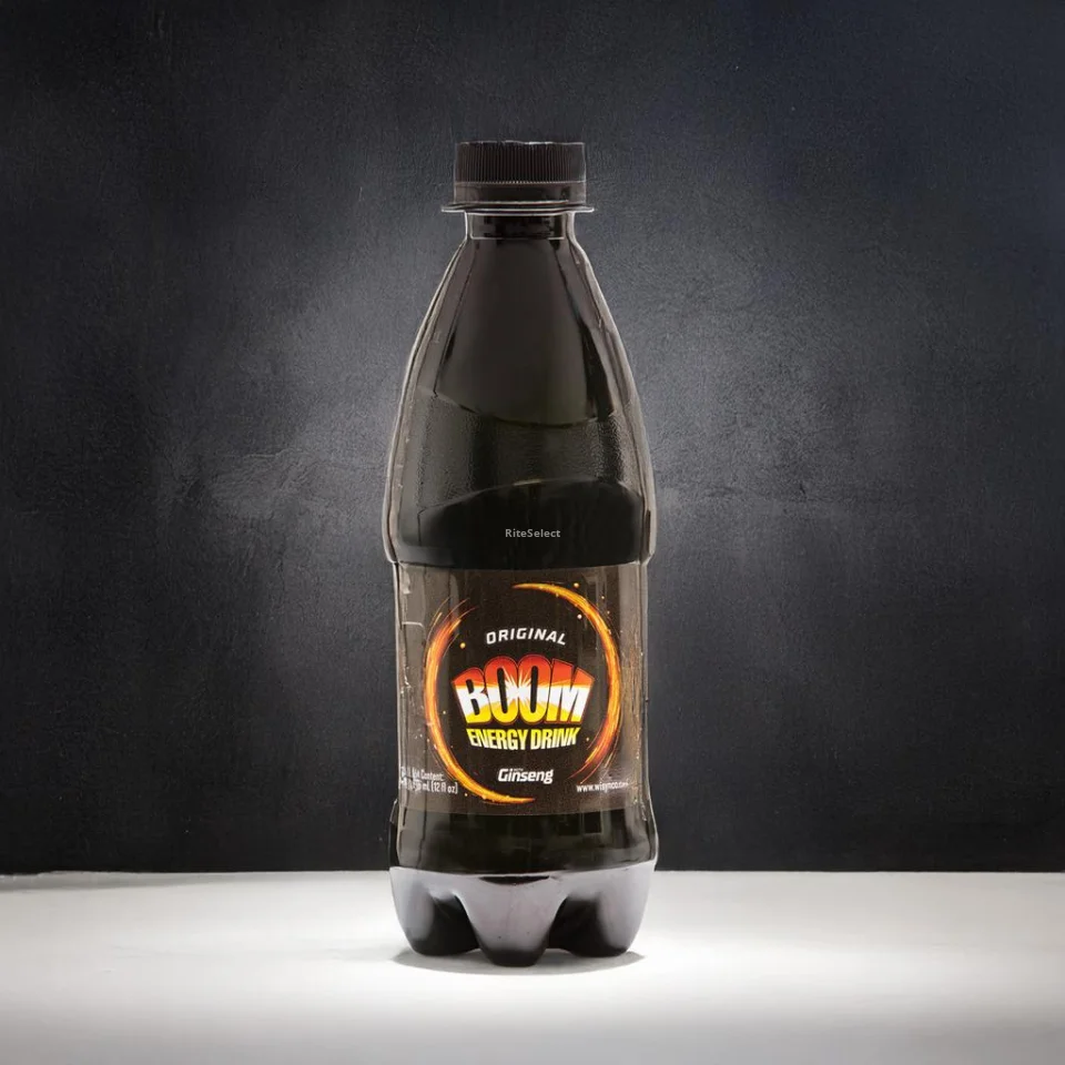 Boom Energy Drink | 24 Units | 355 mL (12 oz) per container | Total Net Weight 8.52 L | Contains Natural Ginseng Extract | Origin: Jamaica | Store at Room Temperature | Keep Out of Direct Light | Carefully Formulated to Preserve Flavor and Quality.