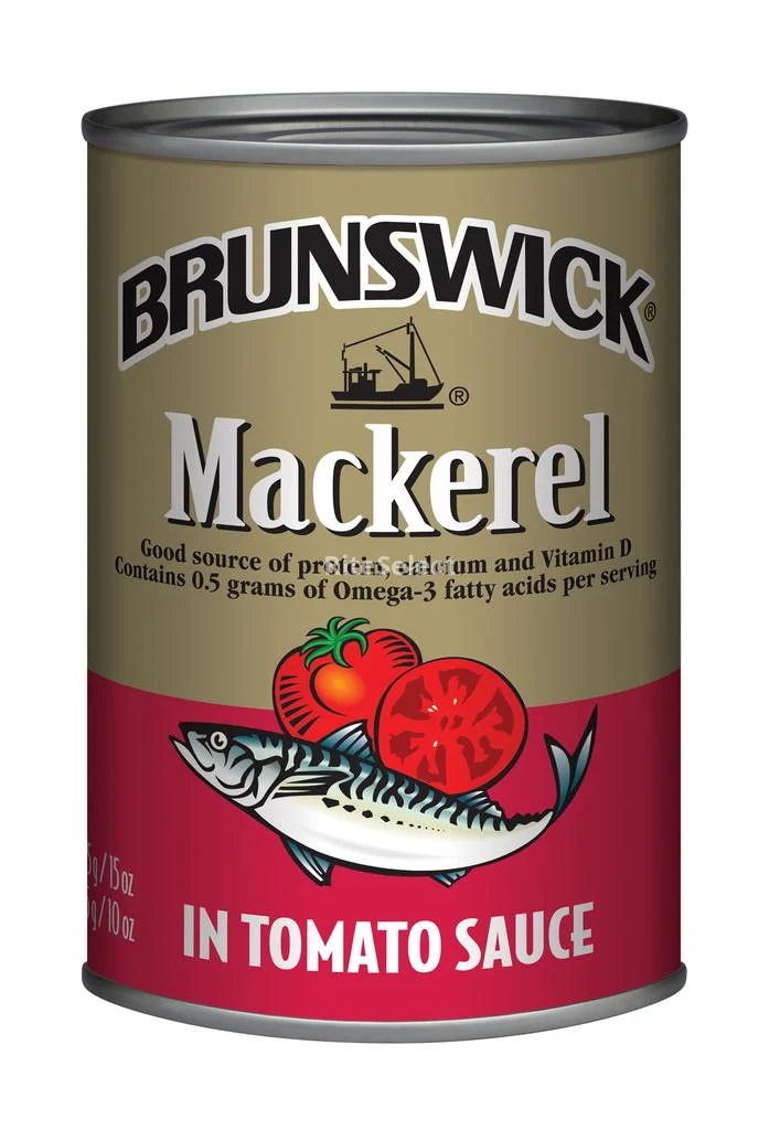 Brunswick mackerel in tomato sauce is a canned product containing mackerel in a tomato-based sauce. It is a source of protein, calcium, and vitamin D, providing 0.5 grams of Omega-3 fatty acids per serving.