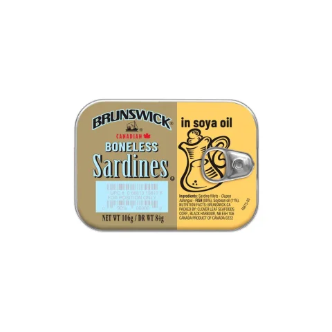 These Brunswick Sardines in Soybean Oil fillets are a rich source of protein and vitamin D, as well as being free of gluten and trans fats. Each serving offers 2.6 g of omega-3 polyunsaturates, making them a healthy choice for everyone in the house. They contain no additives or preservatives, guaranteeing a natural and fresh product. Try them alone or add them to your favorite dishes such as crackers, salads, rice or pasta, and enjoy their flavor and health benefits. Contains a net weight of 106 grams (2.7. oz) per can.