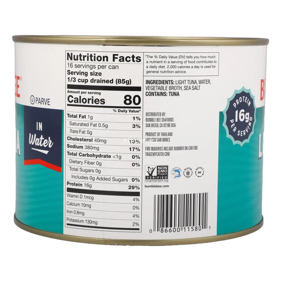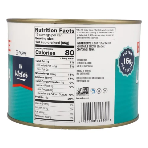 It's time to give your taste buds a chance to fall in love with Bumble Bee's Tuna in Water. This 66.5 oz (1.88 kg) presentation is ideal for your favorite dishes, whether it's a rich tuna sandwich or a succulent casserole. Discover perfection in every bite with this easy, affordable, low-fat tuna, rich in protein and Omega-3. Adaptable to any recipe, with simple ingredients like tuna, water, vegetable broth and sea salt, it's a healthy and delicious choice.