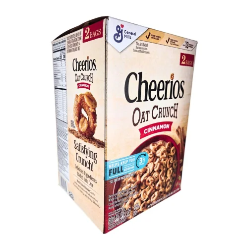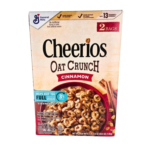 Cheerios Oatmeal Crunch Cereal is a sweetened multigrain cereal made with whole grain oats and topped with real cinnamon. Each bowl contains visible clusters of oats that provide a crunchy texture, offering a hearty snack. The cereal provides a source of dietary fiber from whole grain oats, contributing to healthy digestion.