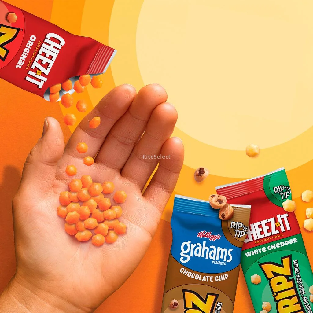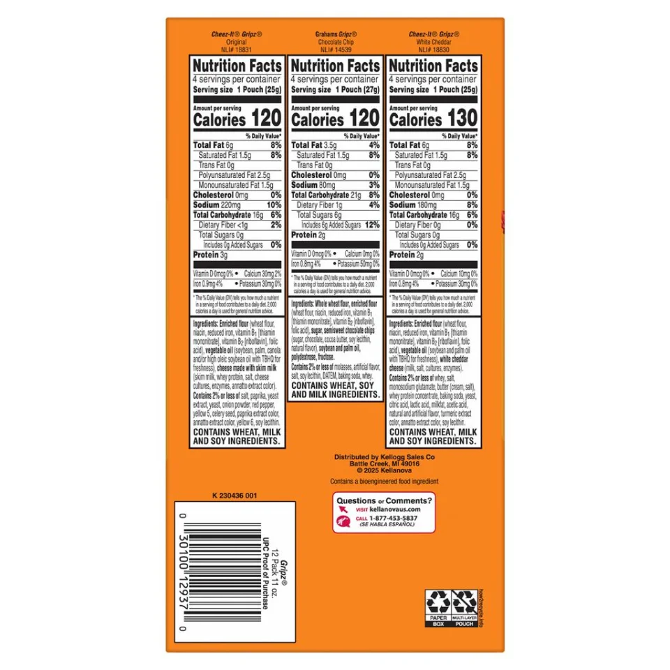 • Gripz Variety Snack Pack | Includes: 4 units of Cheez-It Original, 4 units of Grahams, and 4 units of White Cheddar Cheez-It | Net Weight: 311 g / 11 oz | Assorted pack with 12 individual pouches | Baked, crunchy snacks full of flavor | Perfect for on-the-go | Ideal for kids and adults | From savory to sweet flavors in one presentation | Contains: peanuts, soy, milk, and tree nuts | Made in the USA.