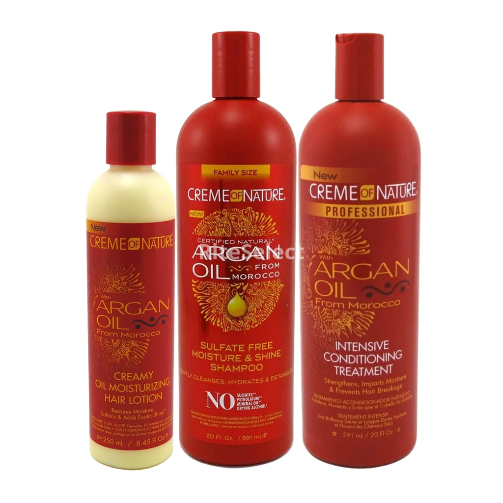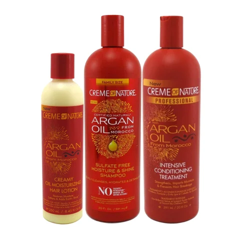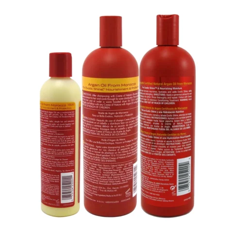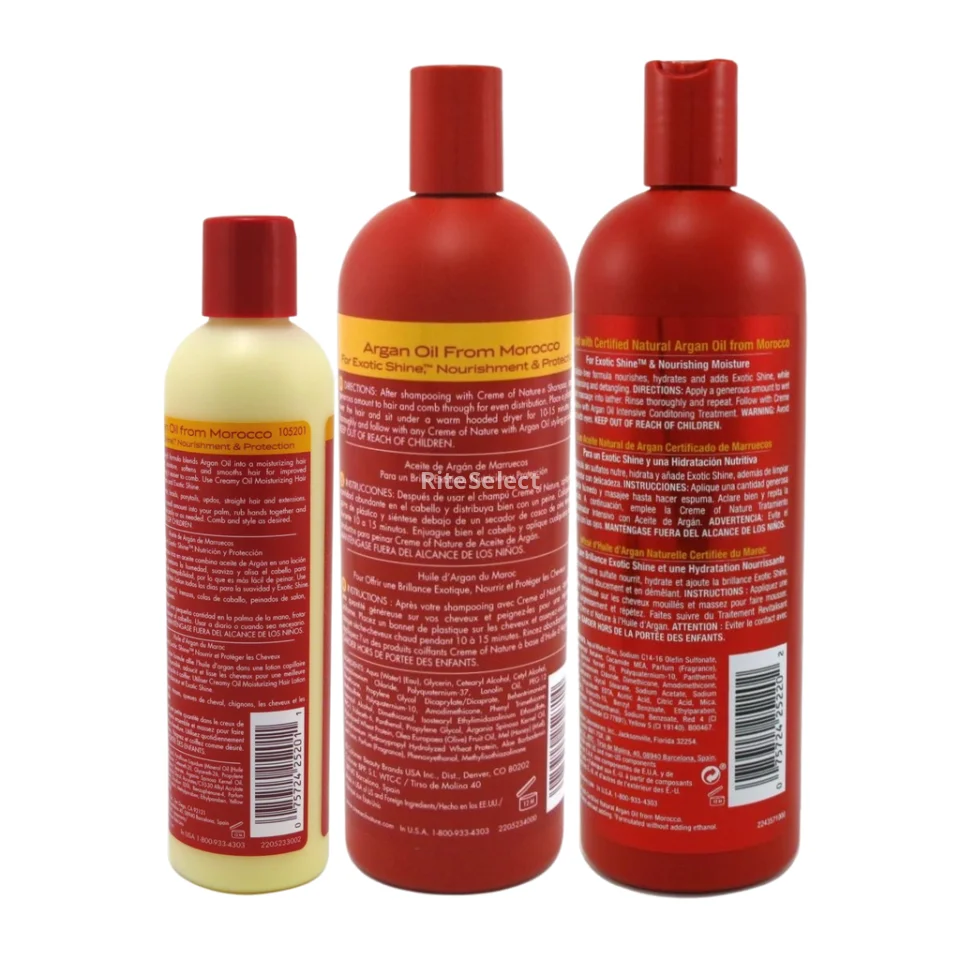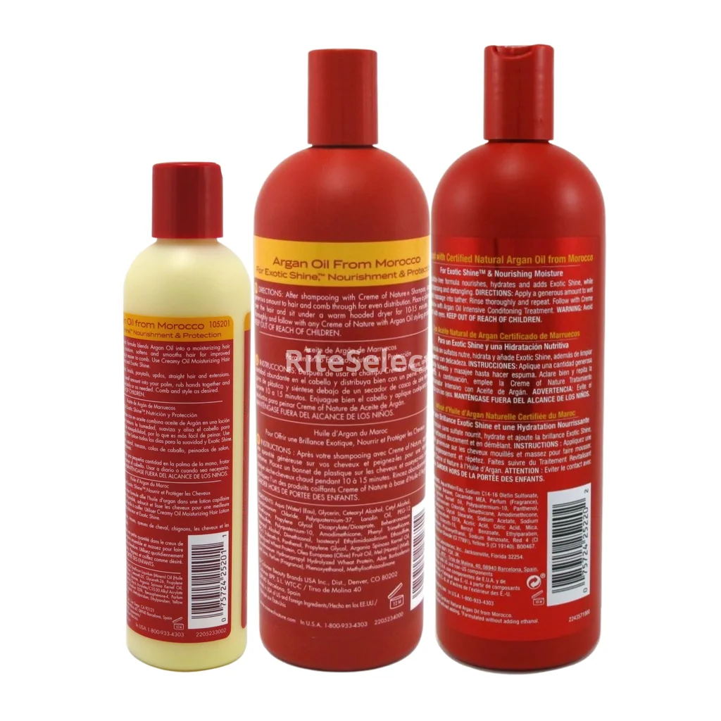 Moroccan Argan Oil Hair Care Maintain beautiful, healthy looking hair with Exotic Shine™ using Crème of Nature hair care products that nourish and rejuvenate all hair types. This complete set that will make your experience more pleasurable and complete leaving your hair silky and shiny.