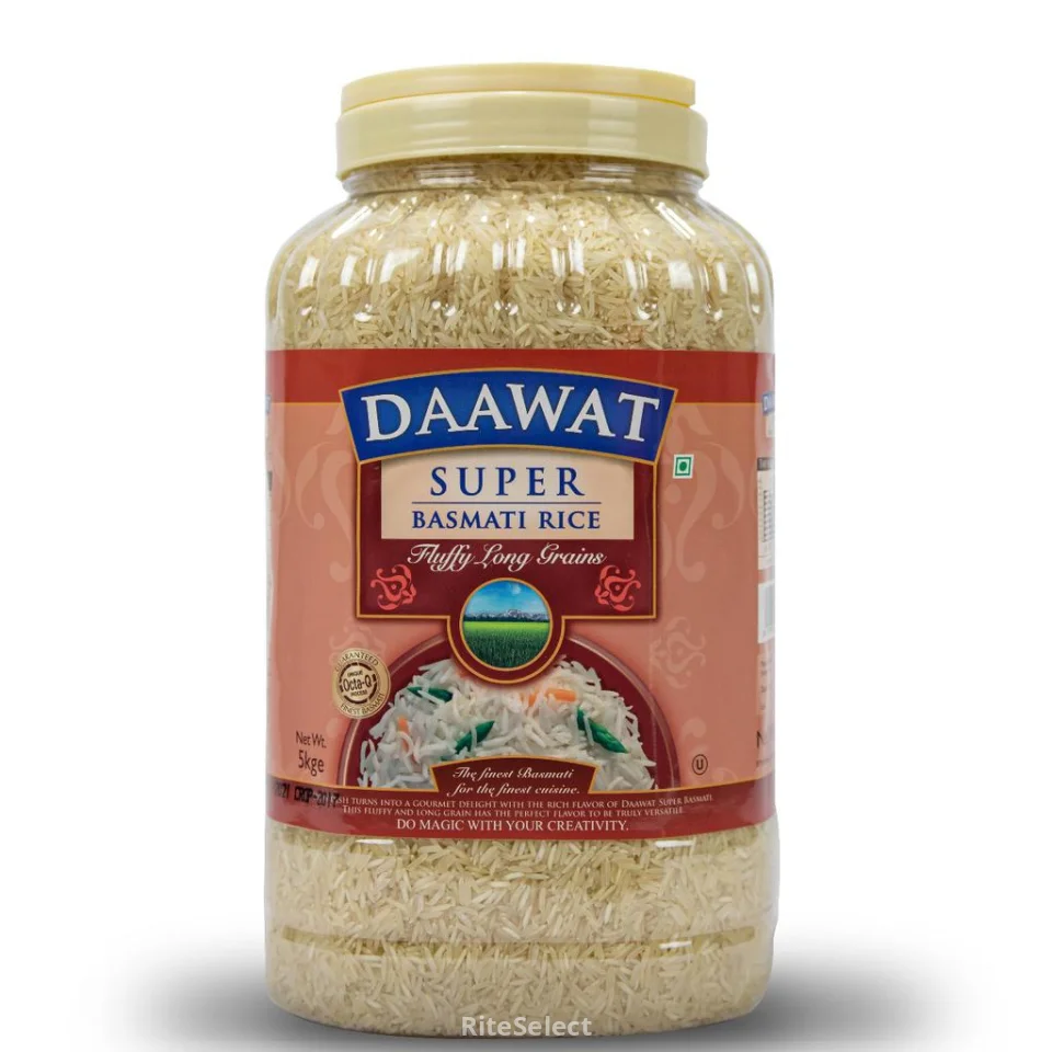 Daawat Long Grain Rice | Type: Premium Basmati | Net Weight: 5 kg / 11 lb | Origin: India | Features: long, aromatic grain that extends up to 20 mm when cooked | Texture: firm, fluffy, and separate | Recommended Uses: Indian, Asian, or gourmet cuisine | Storage: keep in a cool, dry place.