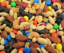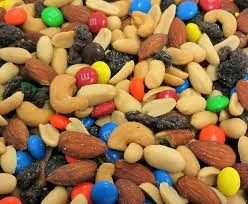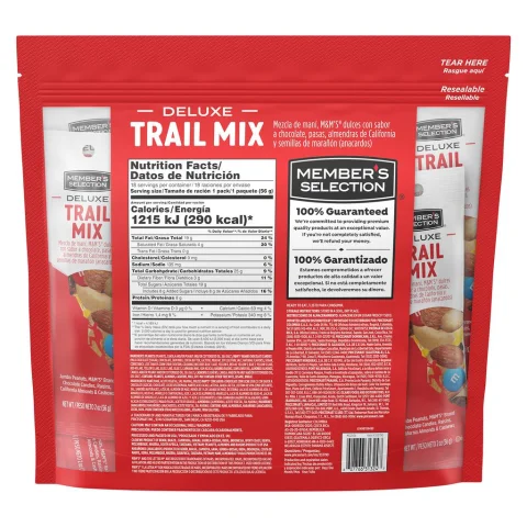 Peanuts (peanuts, canola and/or peanut and/or cottonseed oil, sea salt), m&m's brand chocolate candies (milk chocolate [sugar, chocolate, skim milk, cocoa butter, lactose, milkfat, soy lecithin, salt, natural flavors], sugar, cornstarch, less than 1% corn syrup, dextrin, coloring [includes blue 1 lake, yellow 6, red 40, yellow 5, blue 1, yellow 6 lake, red 40 lake, yellow 5 lake, blue 2 lake, blue 2], carnauba wax, gum acacia), raisins (raisins, sunflower oil), almonds (almonds, canola and/or peanut and/or cottonseed oil, sea salt), cashews (cashews, canola and/or peanut and/or cottonseed oil, sea salt). Contains: peanuts, almonds, cashews, milk, soy. May contain: other tree nuts, sesame, wheat.