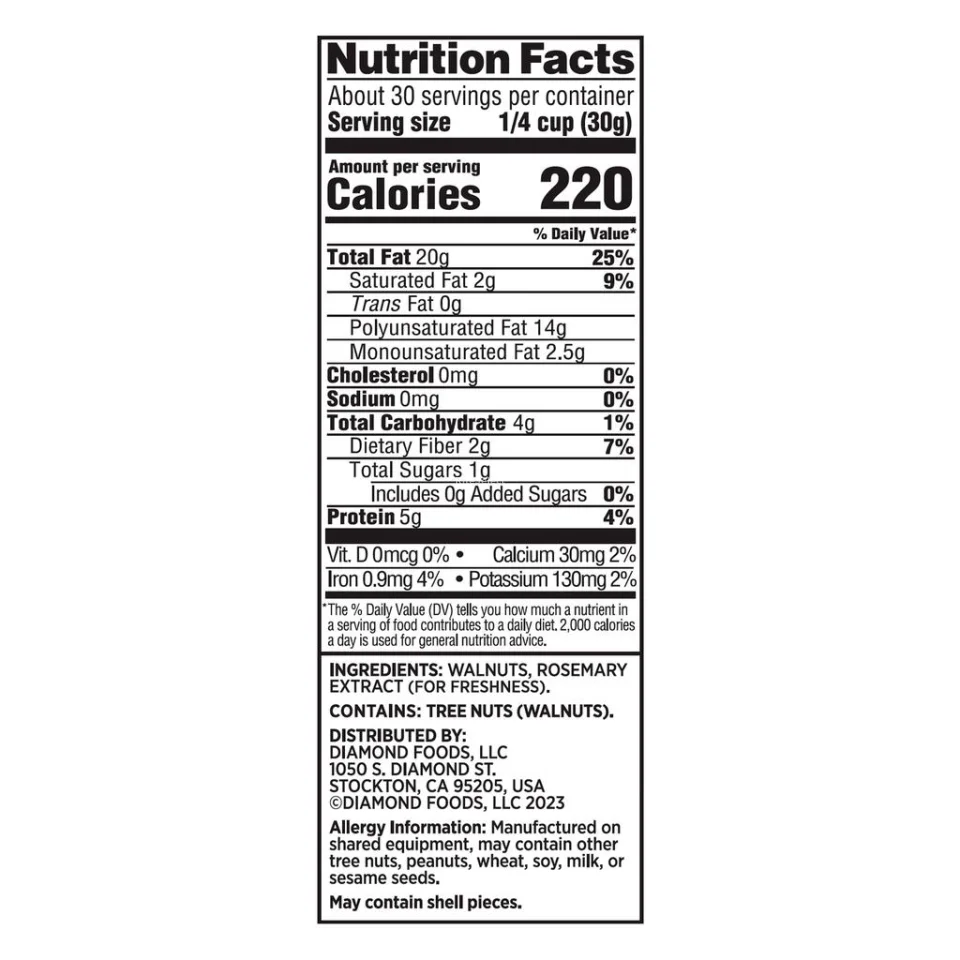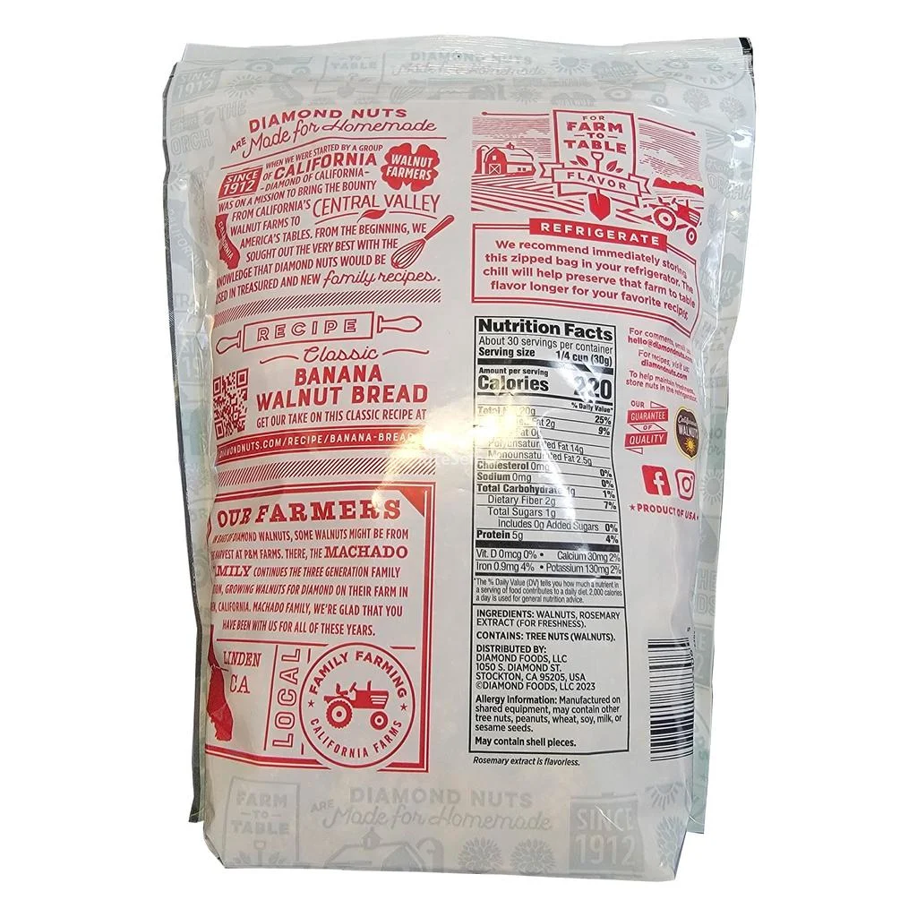• Diamond Shelled Walnuts | Net Weight: 907 g / 32 oz | 100% natural | No Salt | Non-GMO | Kosher certified | Grown and packaged in the United States, guaranteeing quality and freshness | Resealable packaging preserves flavor and prevents moisture | Allergens: Nuts | Store at room temperature.