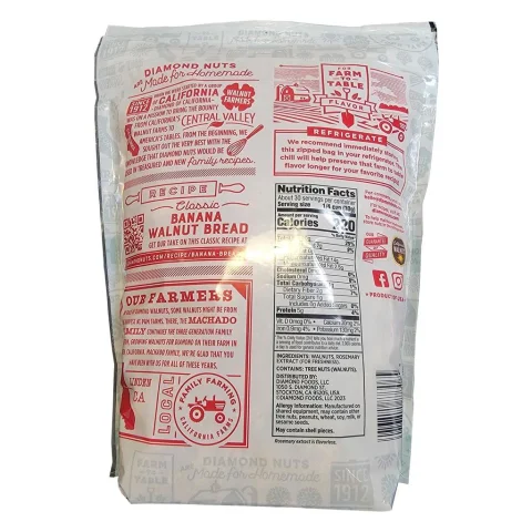 • Diamond Shelled Walnuts, grown in California, are renowned for their high quality and crunchy texture. These walnuts are 100% natural and contain no added salt. Their convenient resealable bag keeps them fresh and flavorful longer, making them perfect for baking, cooking, or enjoying as a healthy snack anytime of the day.
