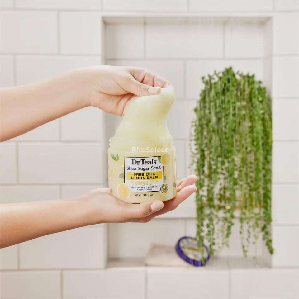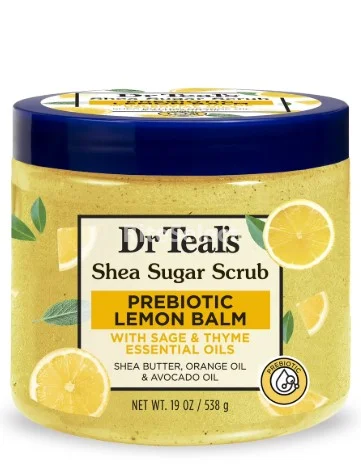 Dr Teal’s Shea Sugar Body Scrub with Prebiotic Lemon Balm and Essential Oils is formulated with Shea Butter and Sugar to exfoliate and smooth skin. Shea butter, orange oil, and avocado oil leave the skin moisturized with every use. Microbiome-friendly Prebiotic Lemon Balm helps support good bacteria to keep your skin in healthy balance, while a blend of Lemon, Sage, and Thyme essential oils helps relax the mind and uplift the mood. Paraben-free, phthalate-free, and never tested on animals, we craft our products to decrease your stress and promote all forms of wellness. Dr Teal's Shea Sugar Body Scrub with Prebiotic Lemon Balm is a great exfoliant for use in the bath or shower, or as a hand scrub to help soften and smooth skin. Pair with your favorite Dr. Teal's product to complete your bath experience.