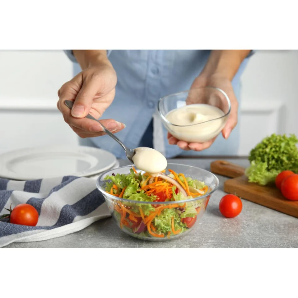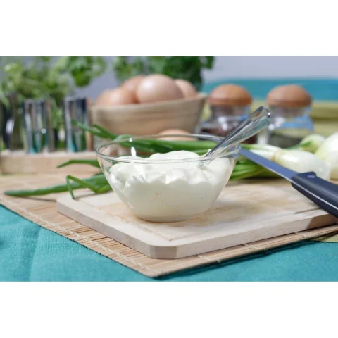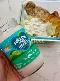 • It contains canola and sunflower oils, organic apple cider vinegar and pea protein, ensuring a creamy texture and a rich, satisfying taste. It is also enriched with folic acid and vitamin B12, essential nutrients often lacking in vegan diets. It is low in saturated fat and high in Omega 3. Egg free. Gluten free.
