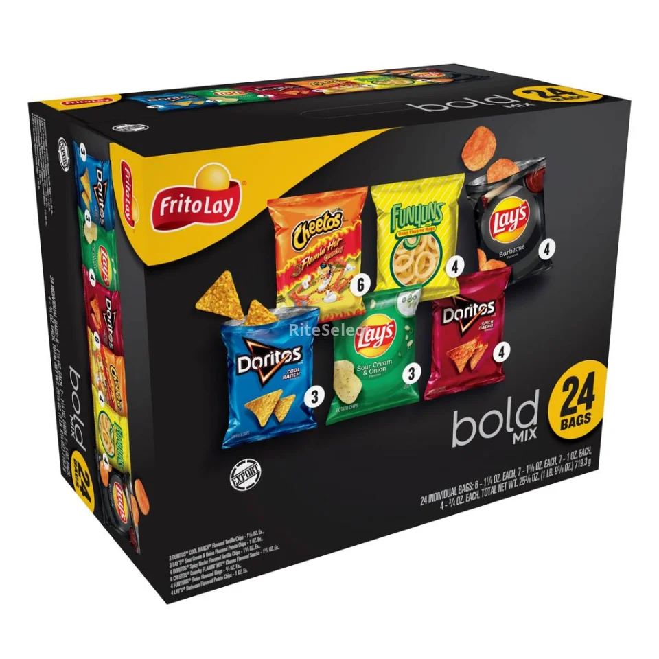 Live a taste experience through each one of these Frito Lay snacks, you'll love them! Take advantage and get this package that includes 3 Doritos Cool Ranch, 3 Lays Sour Cream & Onion, 4 Doritos Spicy Nacho, 6 Cheetos Crunchy Flaming Hot, 4 Funyuns and 4 Lays BBQ. You won't regret it!