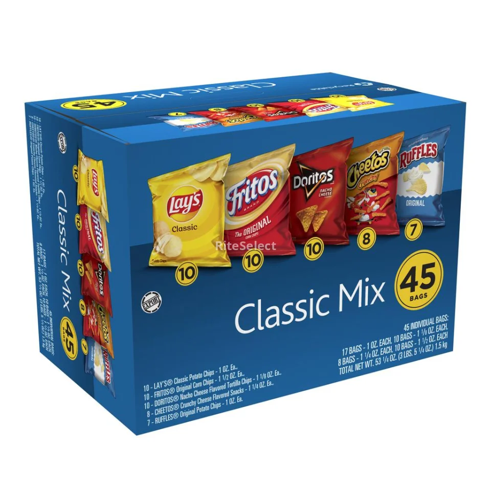 Ideal product for the lunchbox, snack and to savor at any time you want, whether it's a movie night or a get-together with family and friends. This pack includes: 10 LAY'S® Classic. 10 FRITOS® Original. 10 DORITOS®. 8 CHEETOS® Crunchy. 7 Ruffles® Original | Made in the US.