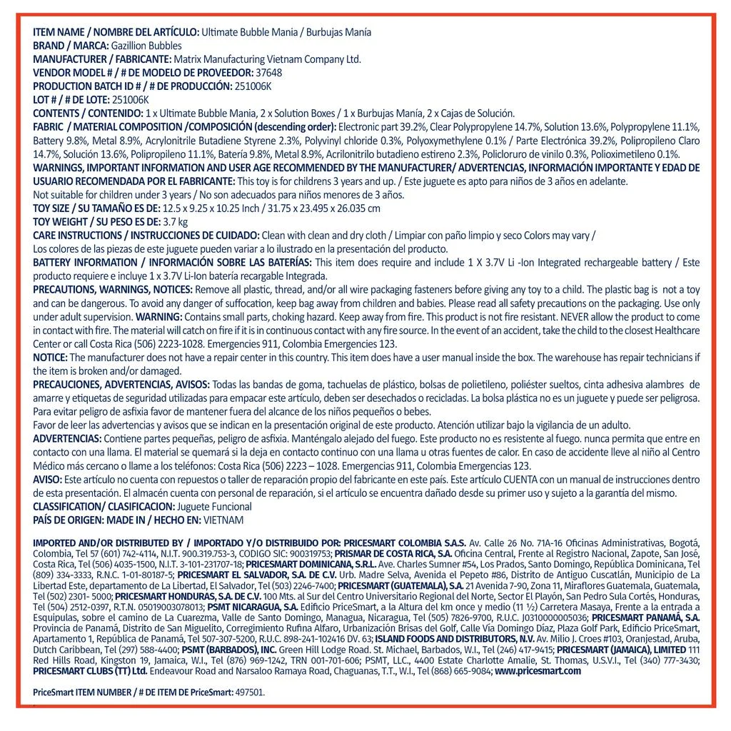 • Automatic bubble machine | Continuous bubble generation | Built-in rechargeable battery | Accessories included: Charging cable | Solution included: 2 bottles of bubble solution | Solution capacity: 1 L / 0.26 gal per bottle | Not suitable for children under 3 years of age | Dimensions: 31.8 cm x 23.5 cm x 26 cm / 12.5“ x 9.25” x 10.25" | Made in Vietnam.