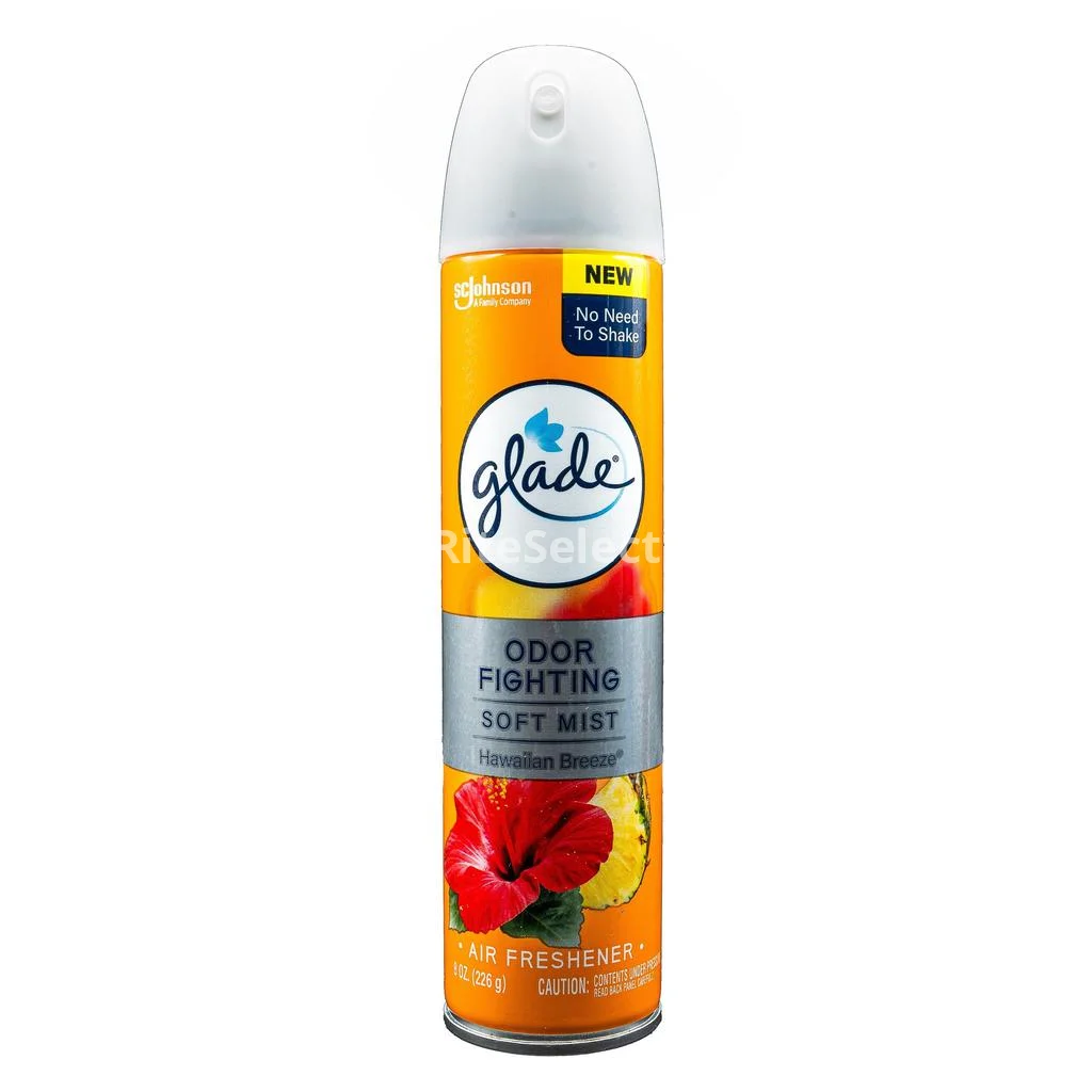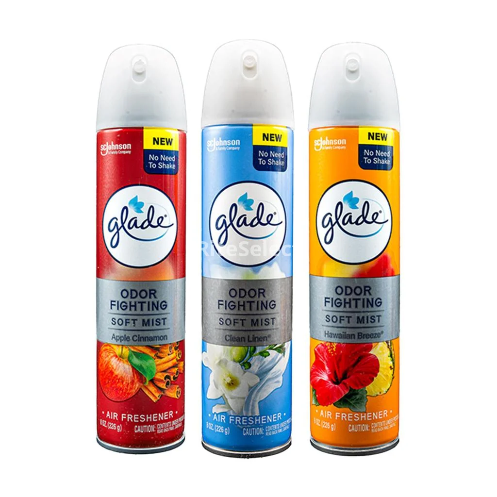 Glade assorted air feshener includes three fragrances: Apple Cinnamon, Fresh Linen and Hawaiian Breeze, in 236 mL containers. Their formula combines dispersing agents and synthetic fragrances to neutralize odors and perfume the environment. Application in well-ventilated interior spaces is recommended.