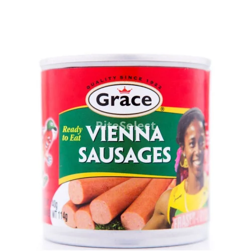 Grace Regular Vienna Sausage | Country of Origin: Jamaica | Net Weight per Can: 140 g / 5 oz | Total Net Weight: 840 g | Brand: Grace | Product Type: Precooked Canned Sausage | Container: Metal Can with Easy-Open Lid | Ready to Eat: Yes | Cooking Required: No, but can be heated if desired | Recommended Uses: Breakfast, lunchboxes, quick recipes, hot snacks | Storage: Store in a cool, dry place.