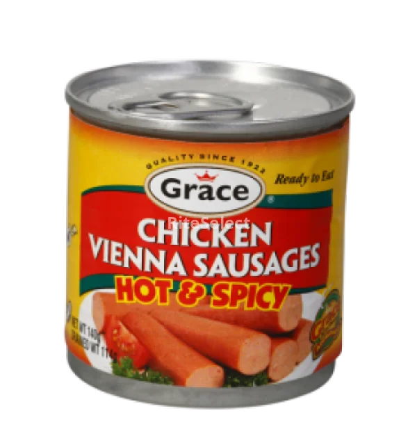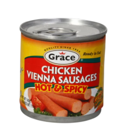 The Grace Spicy Vienna Sausage, a smoky flavor festival with an irresistible spicy kick. Made with high quality chicken and seasoned to perfection, these sausages will transport you to a world of taste sensations. Enjoy their smooth and juicy texture!