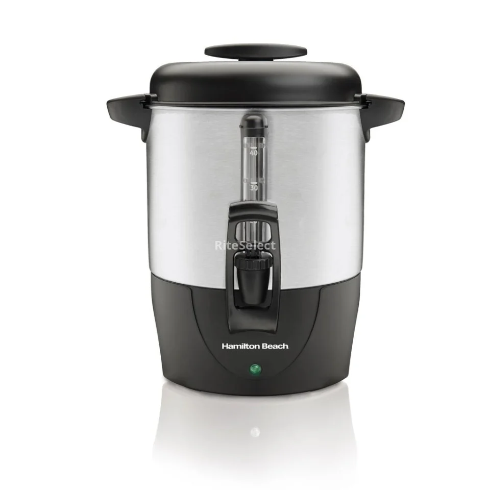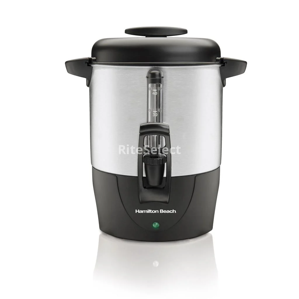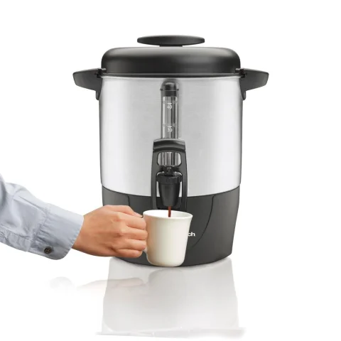 With a (9.4 L) 40-cup capacity, this Hamilton Beach dispensing coffee urn lets you make enough coffee for a large gathering. Dual heaters keep the coffee hot and fresh-tasting, while an easy-press button allows simple use. This coffee urn features a one-hand dispensing and is super easy to fill & clean.
