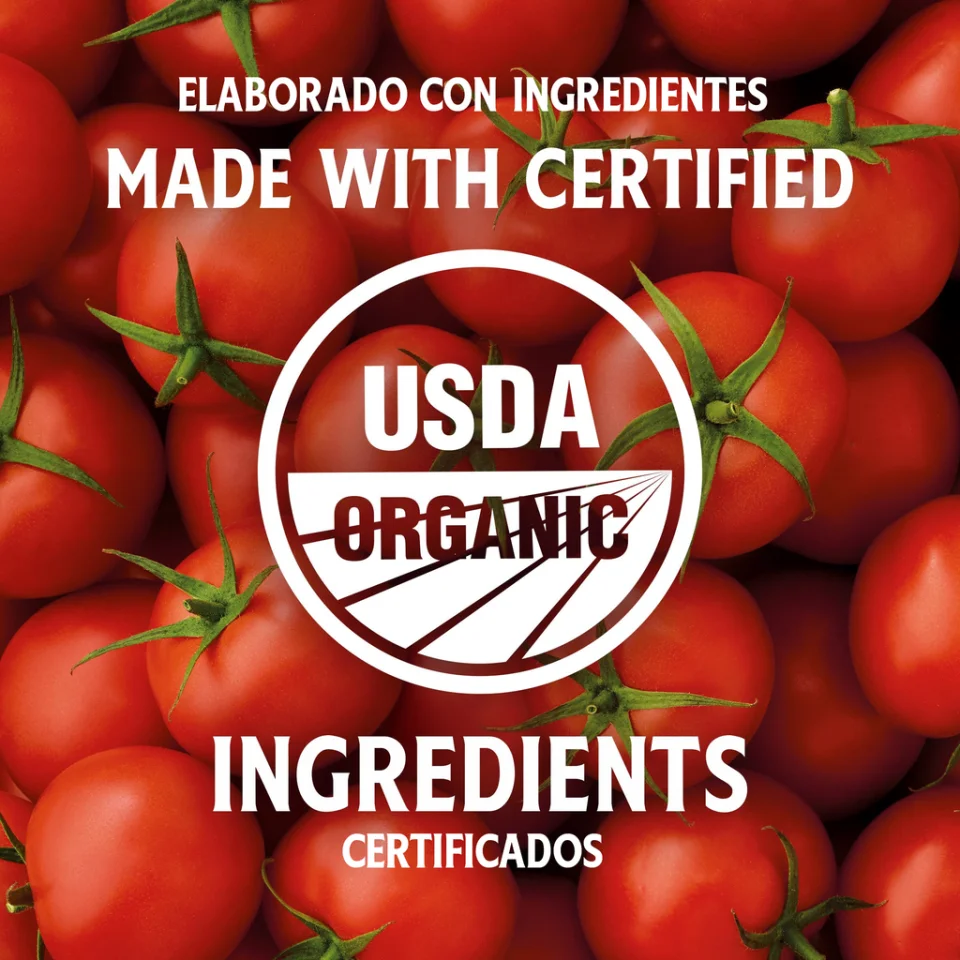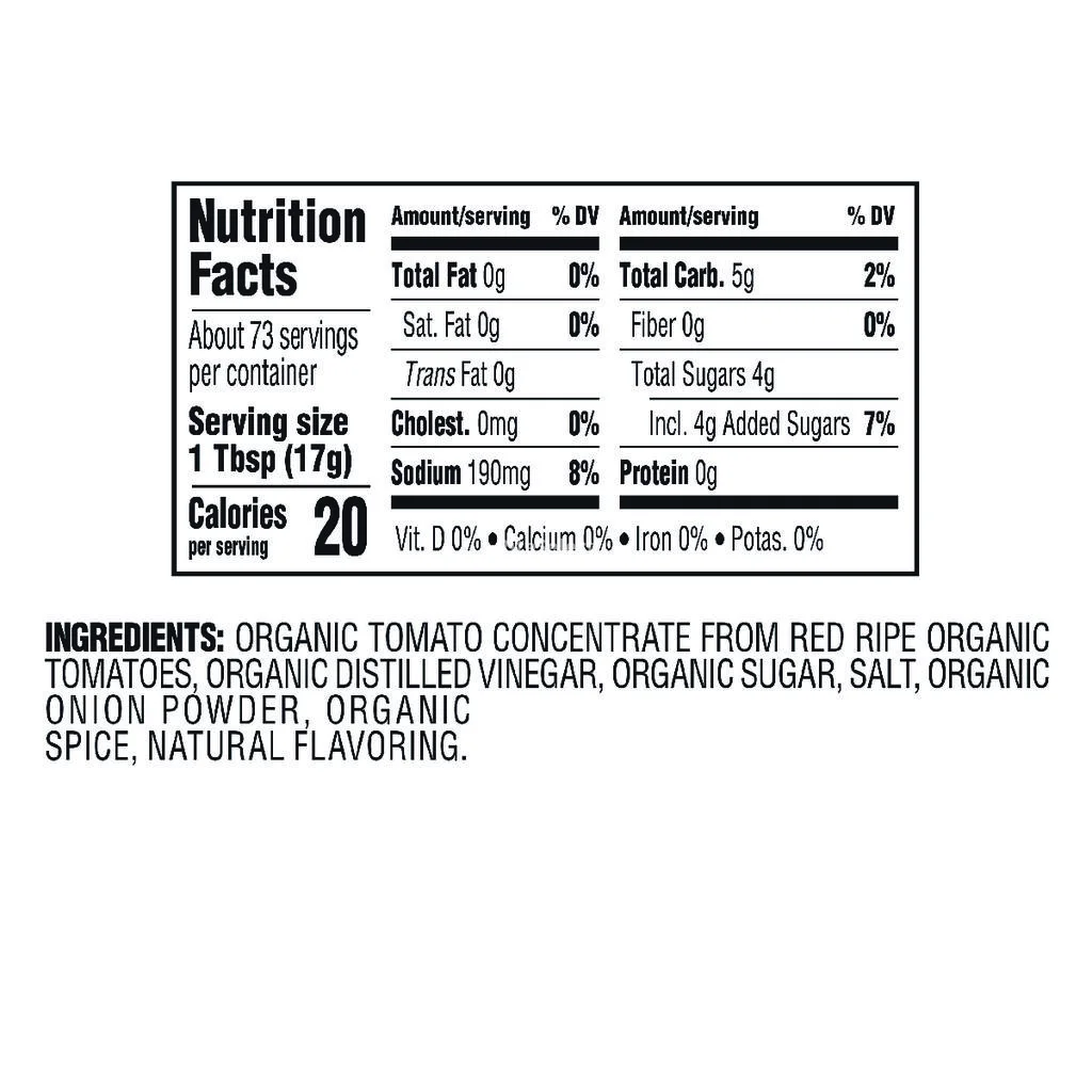 • Organic Tomato Concentrate Made From Organic Ripe Tomatoes, Organic Distilled Vinegar, Organic Cane Sugar, Salt, Organic Onion Powder, Organic Spices, Natural Flavors .