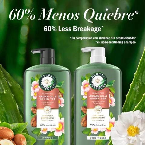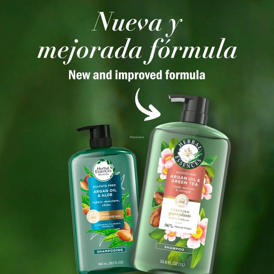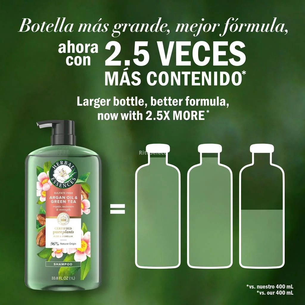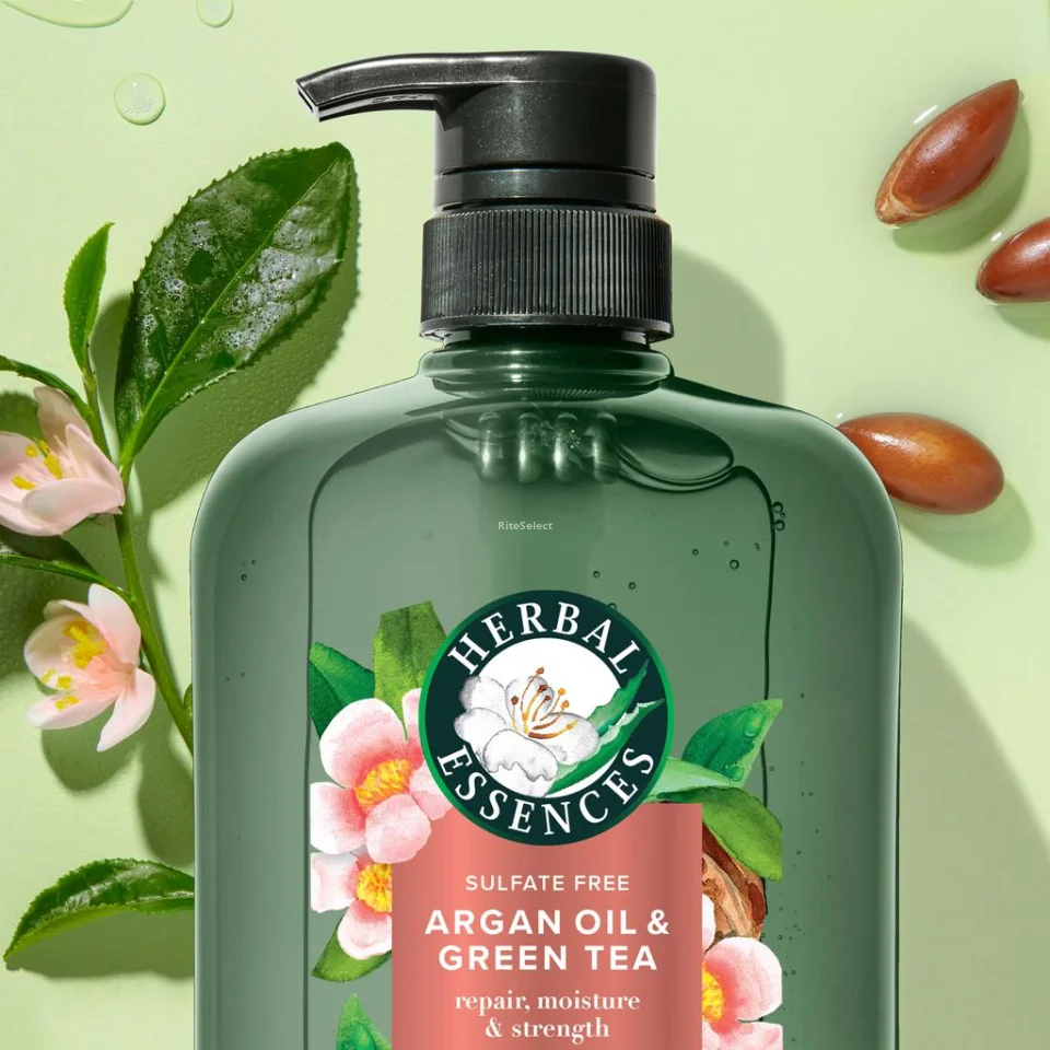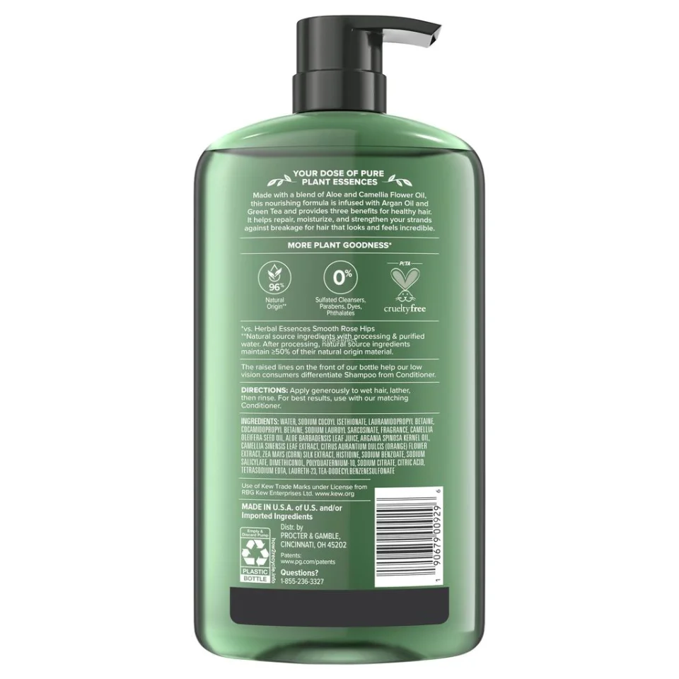 Herbal Essences Shampoo with Argan Oil and Green Tea | 1 L / 33.8 oz | Contains pure botanical extracts that strengthen hair and reduce brittleness | Includes certified camellia oil and aloe vera for intense nourishment and damage protection | Cruelty Free | Unique fragrance with notes of lavender, flowers, and vanilla for a pleasant sensory experience | Made in the USA.
