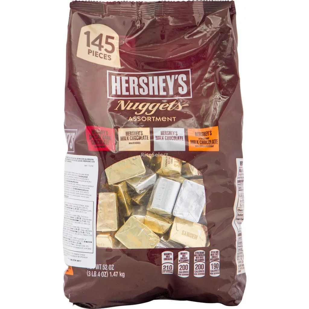 Enjoy this big pack of delicious Hershey's nuggets in a variety of flavors. Try sweet dark chocolate with almonds nuggets, extra creamy milk chocolate nuggets with toffee and almonds; and traditional milk chocolate and dark chocolate nuggets. There is a different chocolate flavor for every occasion.