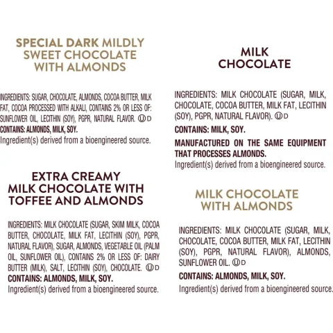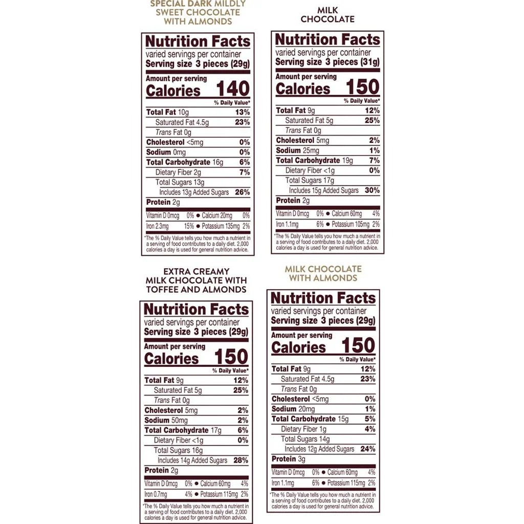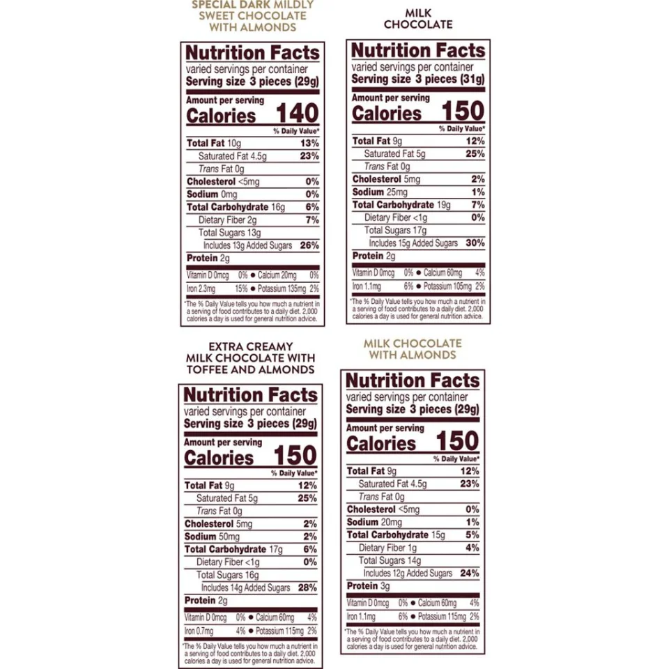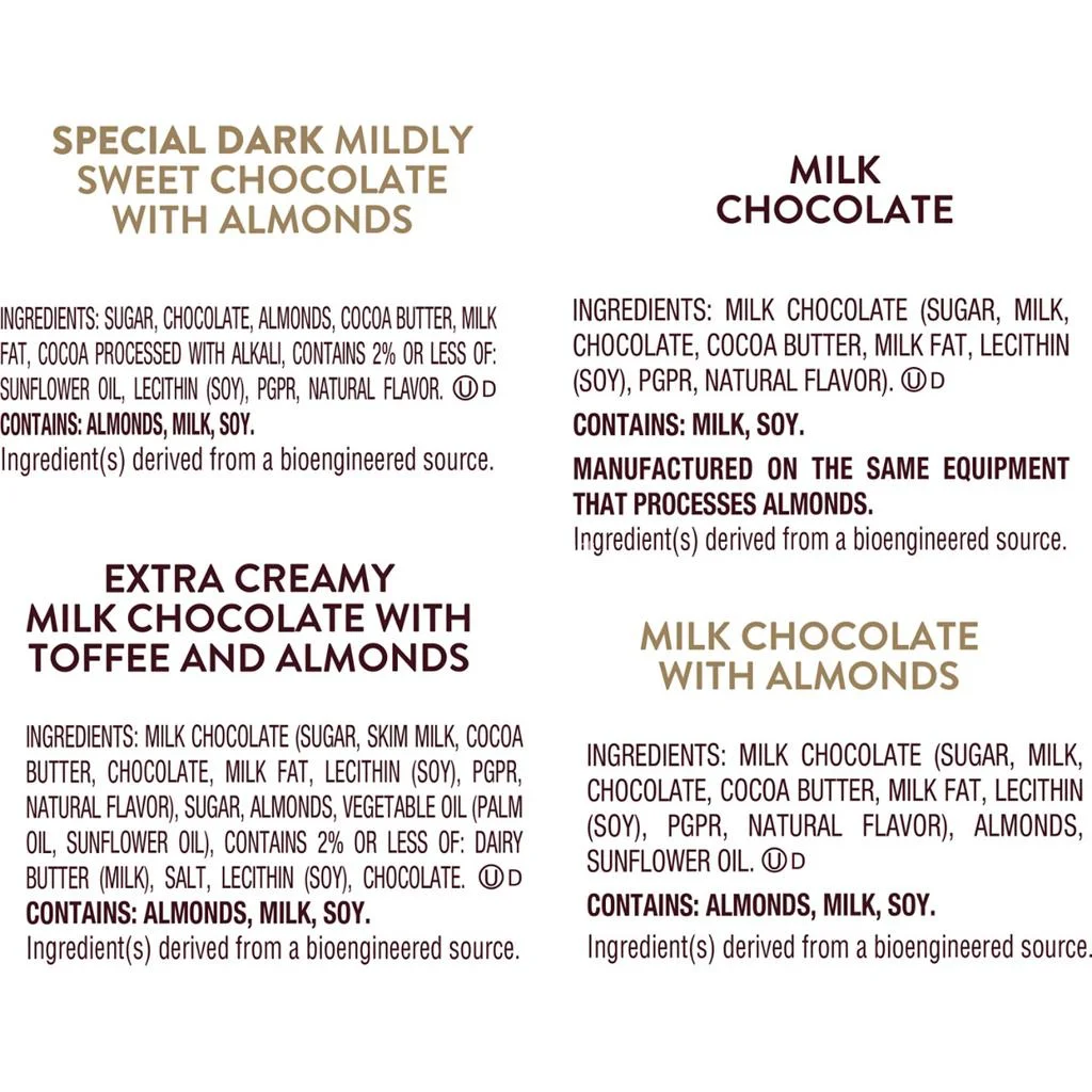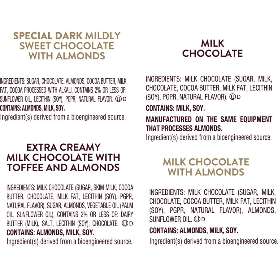 This pack includes: Hershey's special dark chocolate + Hershey's Milk chocolate with almonds + Hershey's milk chocolate + Hershey's extra creamy milk chocolate with toffee and almonds. 145 units per bag | Ready to eat | Store in a cool and dry place.