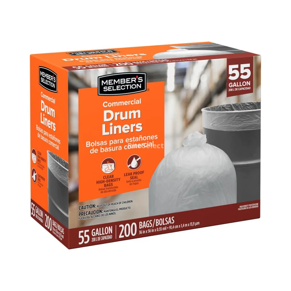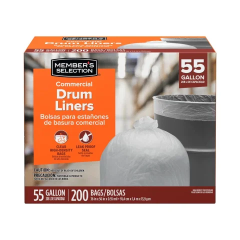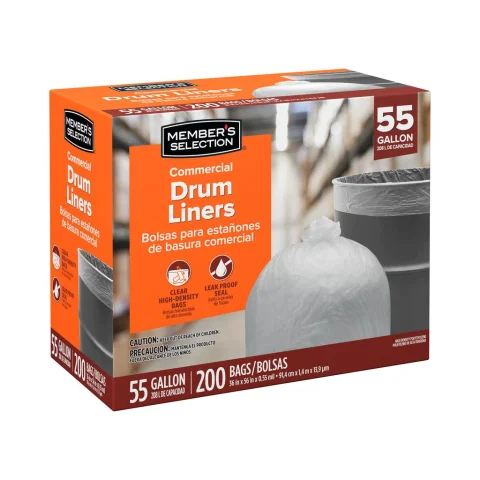 Get superior quality and unbeatable durability with Member's Selection Clear High-Density Trash Bags. Designed to handle heavy loads, these 208 Liter (55-gallon) bags feature a leak-proof seal to prevent messes. With 200 units per package, you'll have plenty of bags to last you a long time.