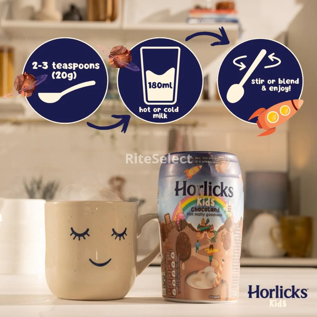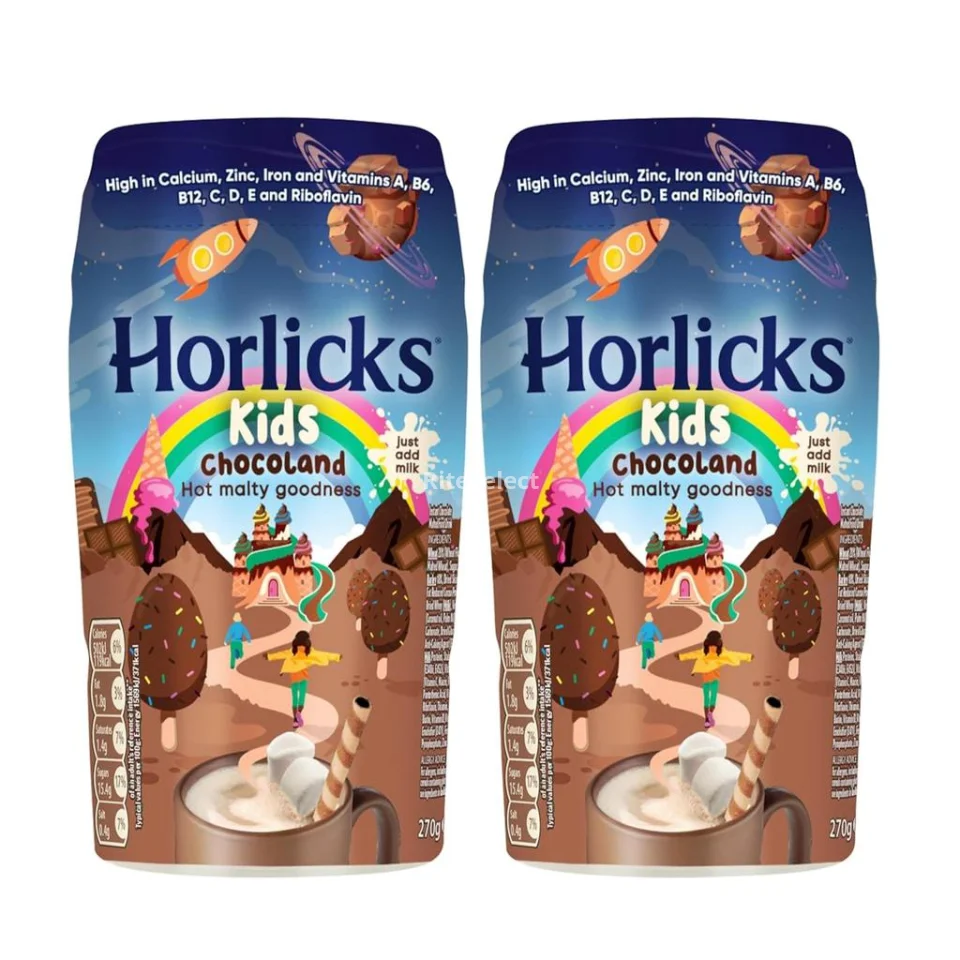 Horlicks Chocoland Kids | Content: 2 Units, 270 g / 9.5 oz each | Kind: chocolate-flavored malt powder drink | Allergens: contains gluten cereals | Made in the United Kingdom | Storage: Store in a cool and dry place.