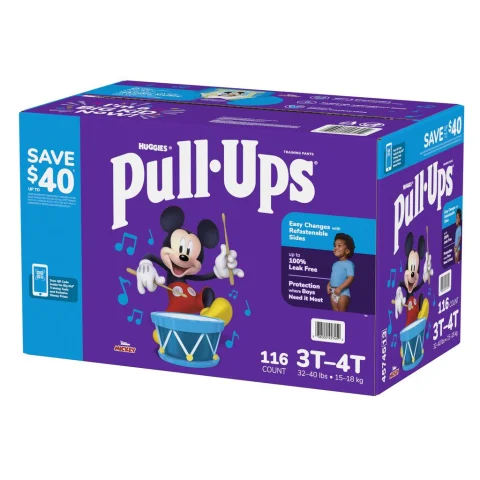 Looking for a training solution for your toddler? Huggies Pull Ups training diaper with waterproof barriers with sizes 3T-4T is the answer you're looking for. Weighing 15 - 18 kg / 32 - 40 lb, these diapers are designed to keep kids protected throughout the day and night. Changing diapers is super easy thanks to the easy-open sides. Best of all, they're made of a soft material that provides underwear-like comfort, so your little one will feel comfortable and secure as he learns to potty train on his own.