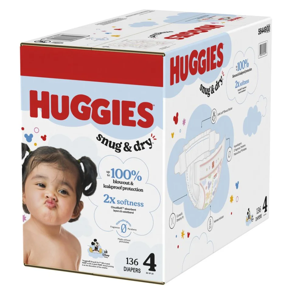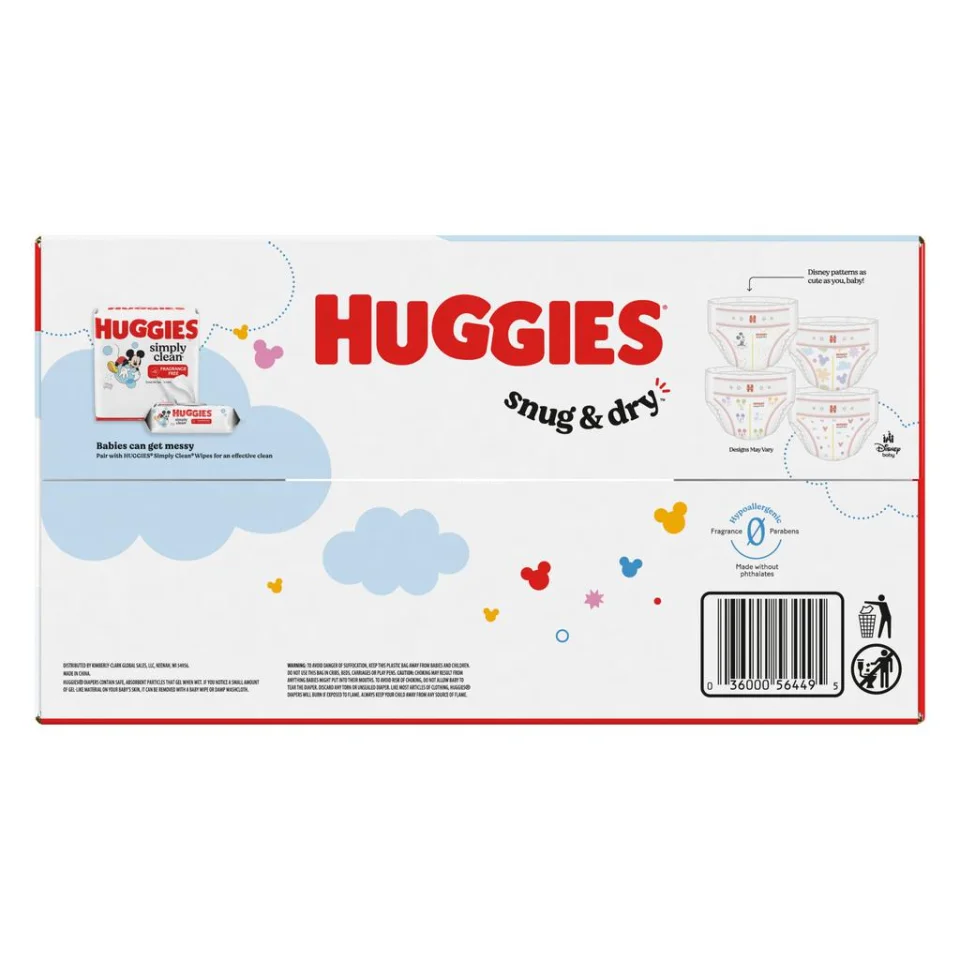 • Huggies Snug & Dry is designed to provide exceptional softness and soft protection in each of its diapers | Size 4 (22-37 lb) | 136 units | Made with no fragrance | no added lotions | no parabens | no natural rubber latex | up to 100% protection against leaks and spills | leak blocker | curved and elastic fit | CloudSoft absorbent layers and waist for added softness | wetness indicator to know when to change the diaper | designed for sensitive skin | includes exclusive Disney designs.