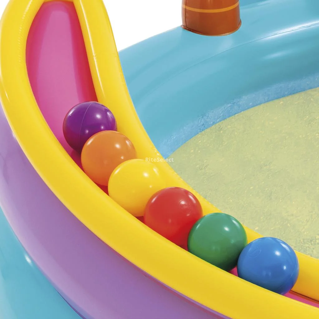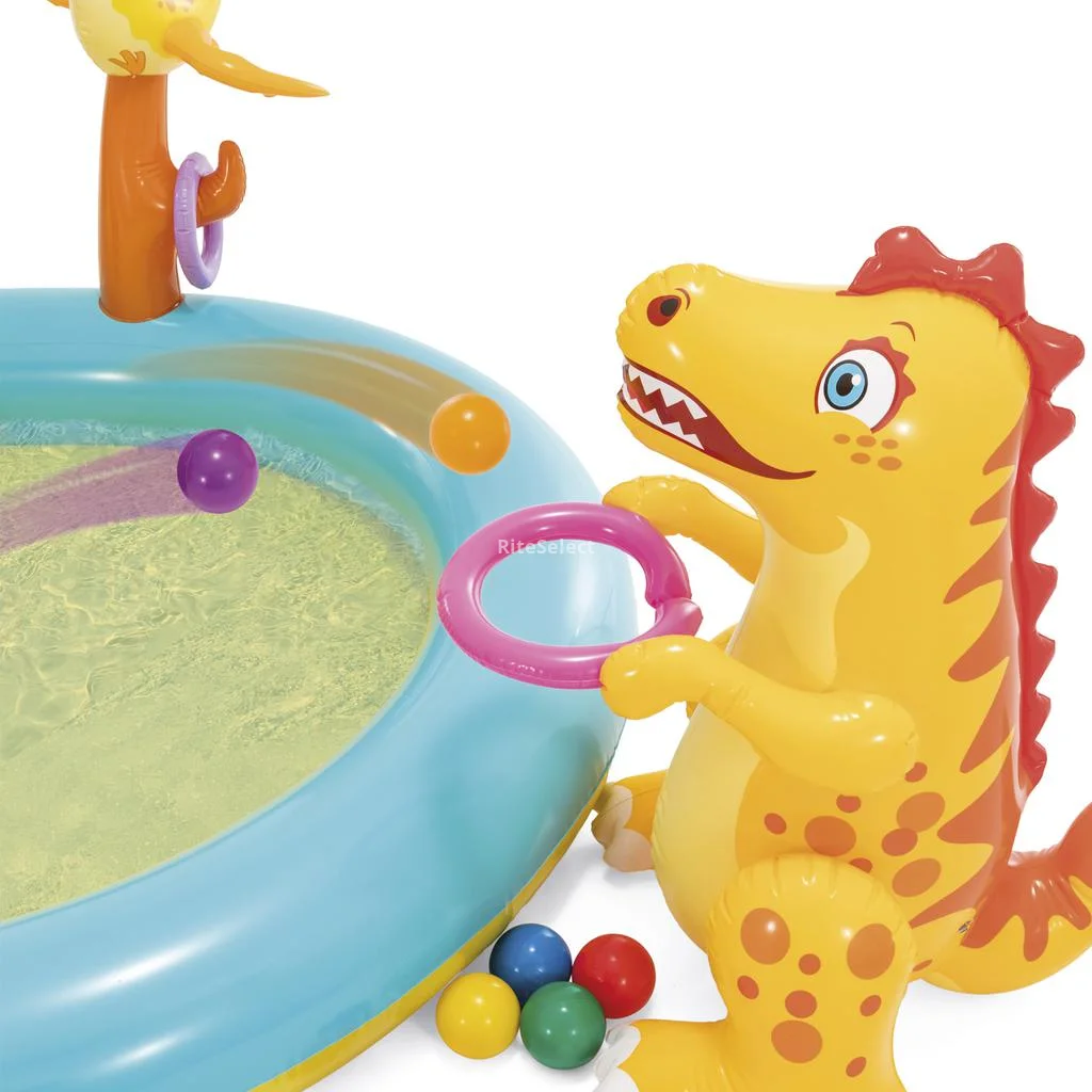 • Specially designed for little ones, this pool features an appealing dinosaur-shaped water sprayer that easily connects to a garden hose, providing a refreshing experience while they play. With a spacious and comfortable area, the pool includes a landing mat that ensures a soft slide landing, guaranteeing hours of safe entertainment. To enhance the fun, it comes with six 8 cm / 3.1" balls and dinosaur ring toss games that encourage physical activity and coordination. Additionally, the set includes a repair patch and drain plug for easy cleaning and maintenance.