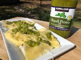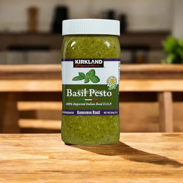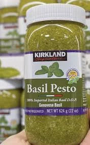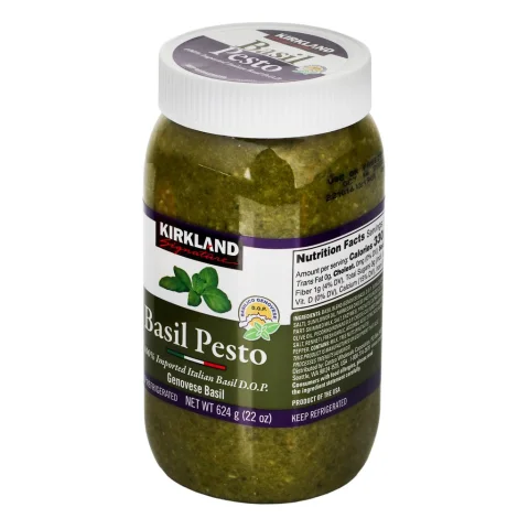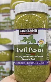 • The key ingredient in pesto is basil and Kirkland Signature's pesto is Italian Genovese basil, a natural flavor with extra virgin olive oil and Parmesan cheese. This product is made with 100% imported Italian basil, making it a high quality product perfect for original recipes. It works very well added to pasta, pizza and paninis, also in chicken and fish dishes.