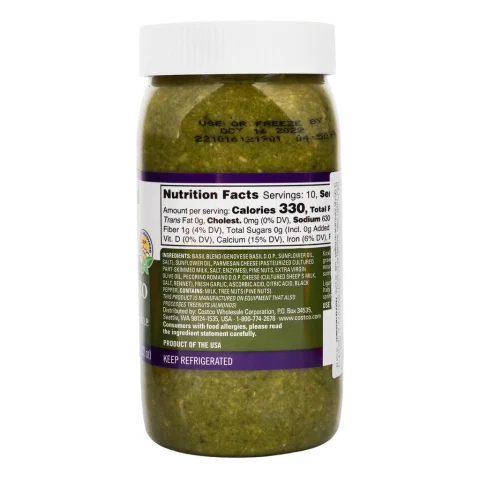 • Pesto 100% Genovese basil imported from Italy. Net content 624 g. Keep refrigerated. For best flavor, keep at room temperature for 10 minutes. Contains: milk, nuts. Product from United States.