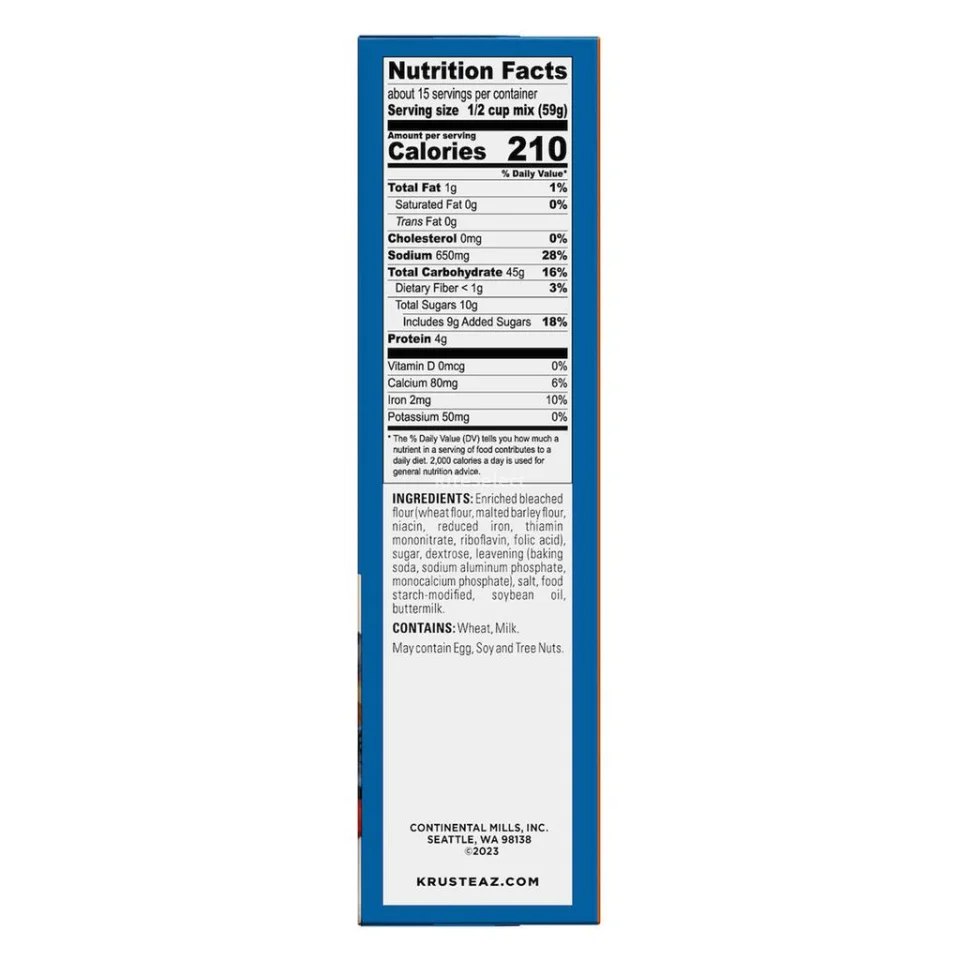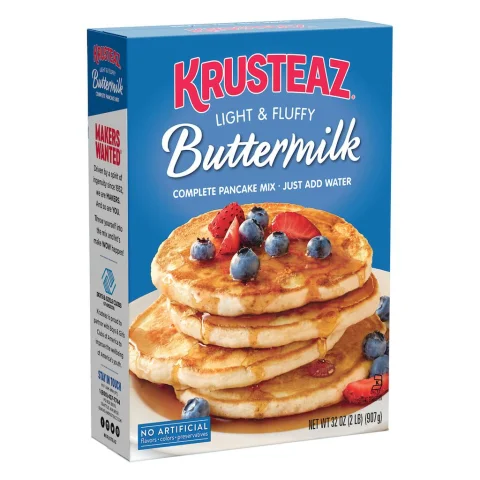 Preparing pancakes is easier and more delicious with Krusteaz Buttermilk Pancake Mix. This complete mix allows you to obtain irresistibly fluffy and light pancakes by just adding water, with no need for additional ingredients. Its special formula with buttermilk enhances flavor and texture, achieving a perfect balance between softness and crispy golden in each bite.