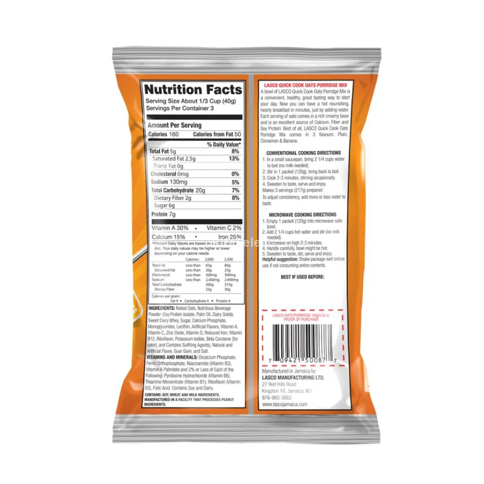 Lasco oatmeal porridge mix 1 Unit | Total weight 120 g | This pack contains 3 servings | Prepare with water, no milk needed| Provides calcium, fiber, and soy protein | Eat as a hot and hearty breakfast | Practical option to prepare in minutes | Made in Jamaica.