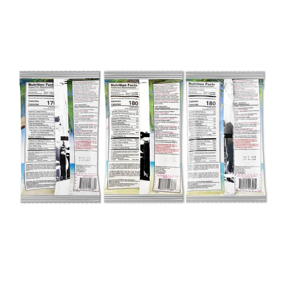 • Nutritious soy-based powder beverage in assorted flavors | Flavors included: vanilla (6 Units), strawberry (2 Units), chocolate (2 Units), creamy malt (2 Units) | Content per Unit: 120 g | Total net content: 1.44 kg | Individual sachets | Made in Jamaica | Sealed flexible packaging | Store in a cool and dry place at room temperature, protected from moisture and direct light.
