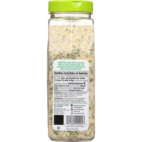 Form Powder Storage Cool and dry place Unit Weight (Each) 935.0000 g Net weight 935.0000 g Type of spice Garlic Salt Package Quantity (Counts) 1 Allergens Does Not Contain Any of the Major AllergensBrand Lawry's