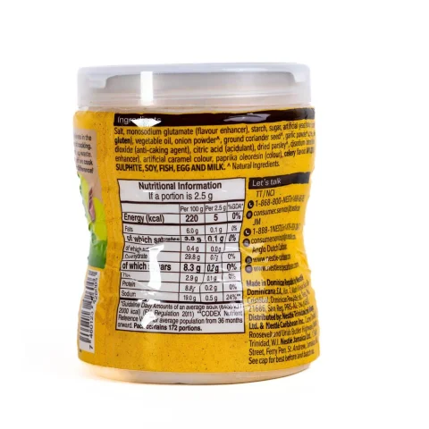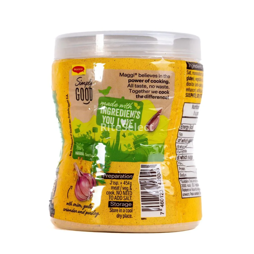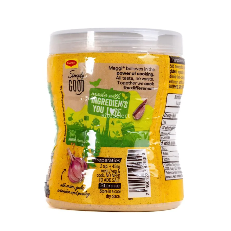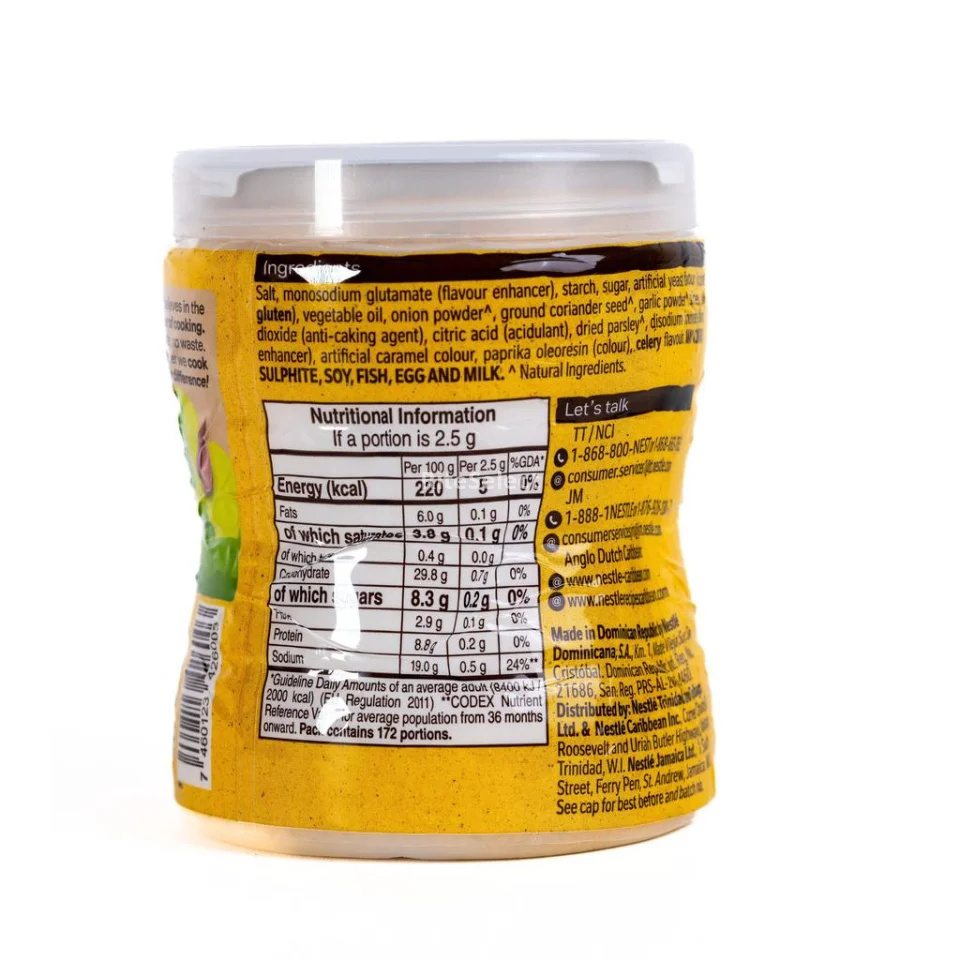 Form Powder Storage Cool and dry place Unit Weight 430.0000 g Net weight 430.0000 g Type of spice All Purpose Seasoning Trans Fat Free No Package Quantity (Counts) 1 Country of Origin Dominican Republic Allergens MilkÂSulfatesÂEggsÂFish (e.g., bass, flounder, cod)ÂSoyBrand Maggi