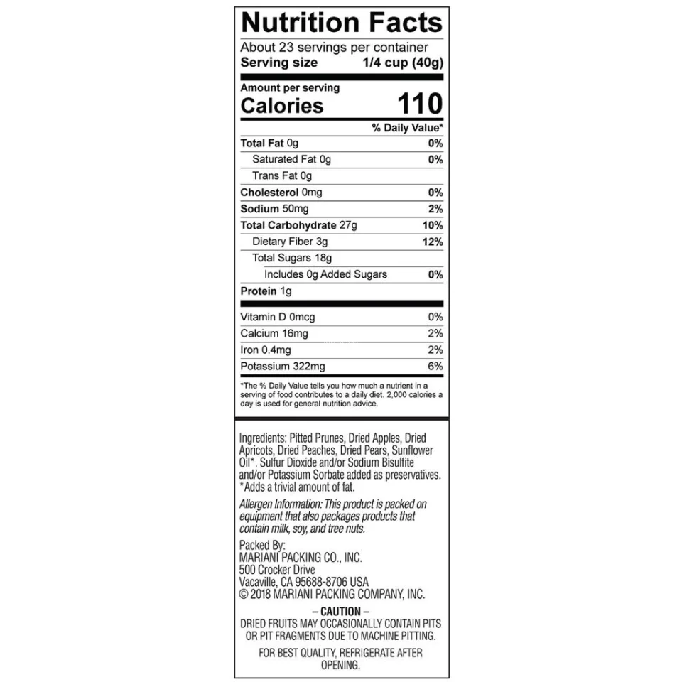 • Pitted prunes, dried apples, dried appricots, dried peaches, dried pears, sunflower oil.