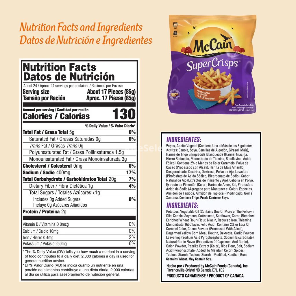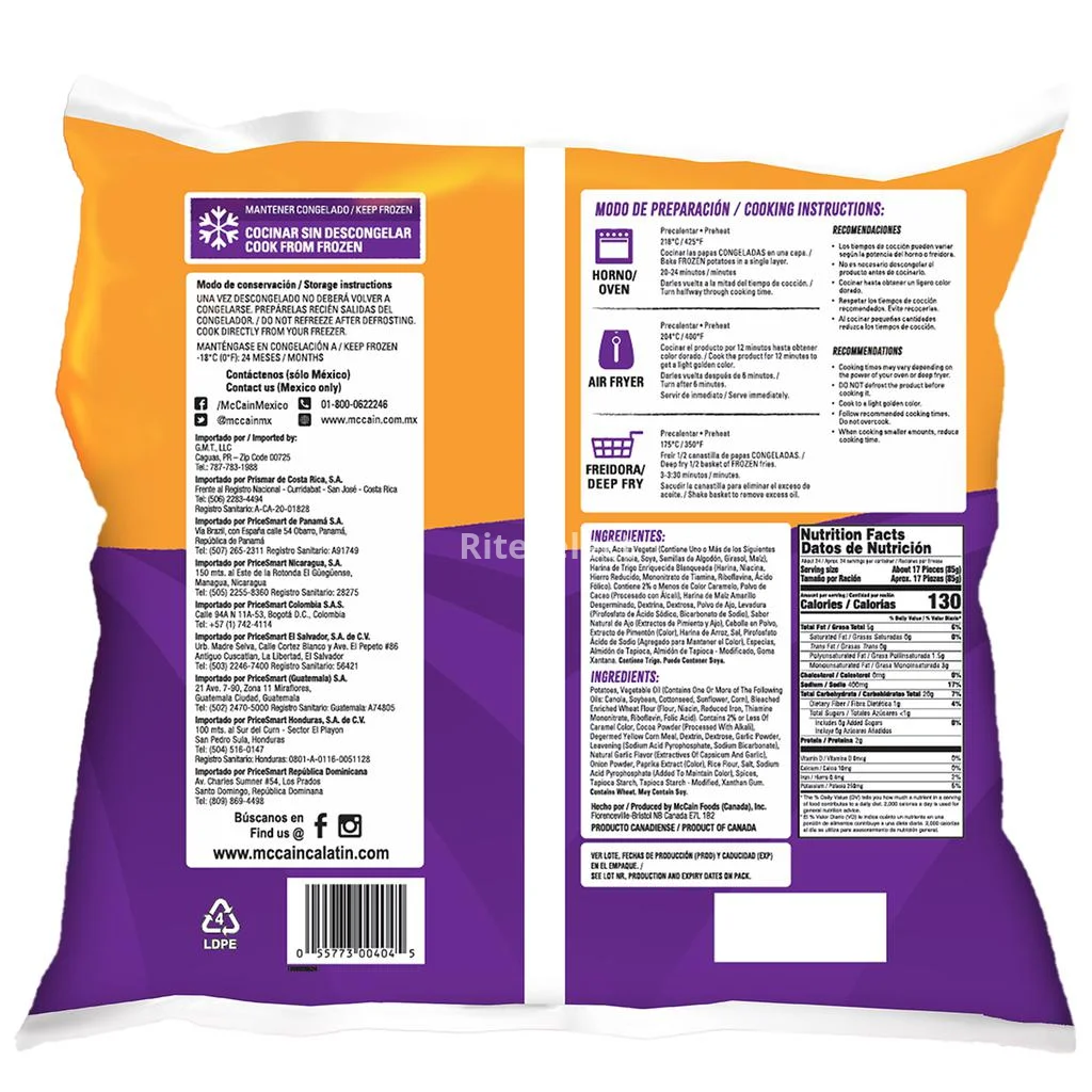 Imported product | Straight cut seasoned potato, without peel. Take home exquisite products made to your specifications and with the best ingredients. McCain potato chips are of the highest quality, carefully selected, ensuring the best potatoes through rigorous quality controls at each step of production.