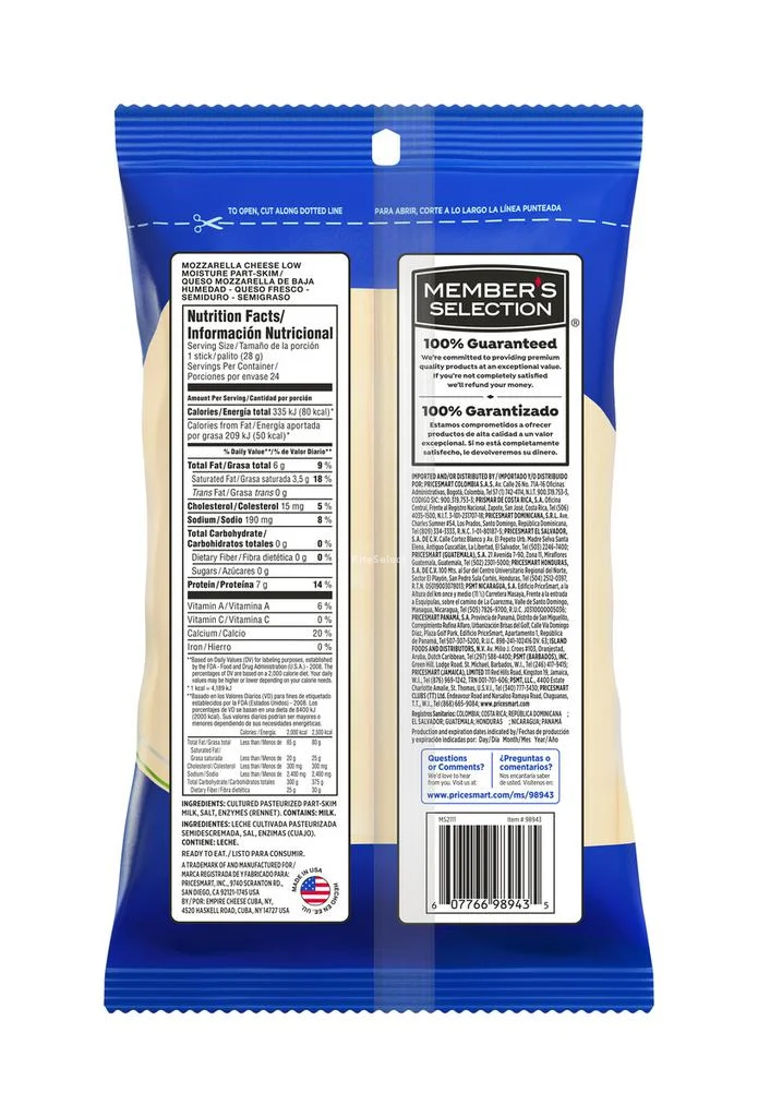 • Made with fresh, semi-hard and semi-fat cheese, low moisture semi-skim mozzarella cheese. Individually packed sticks. Keep refrigerated. Ready to eat. Net content 680 g / 24 oz.