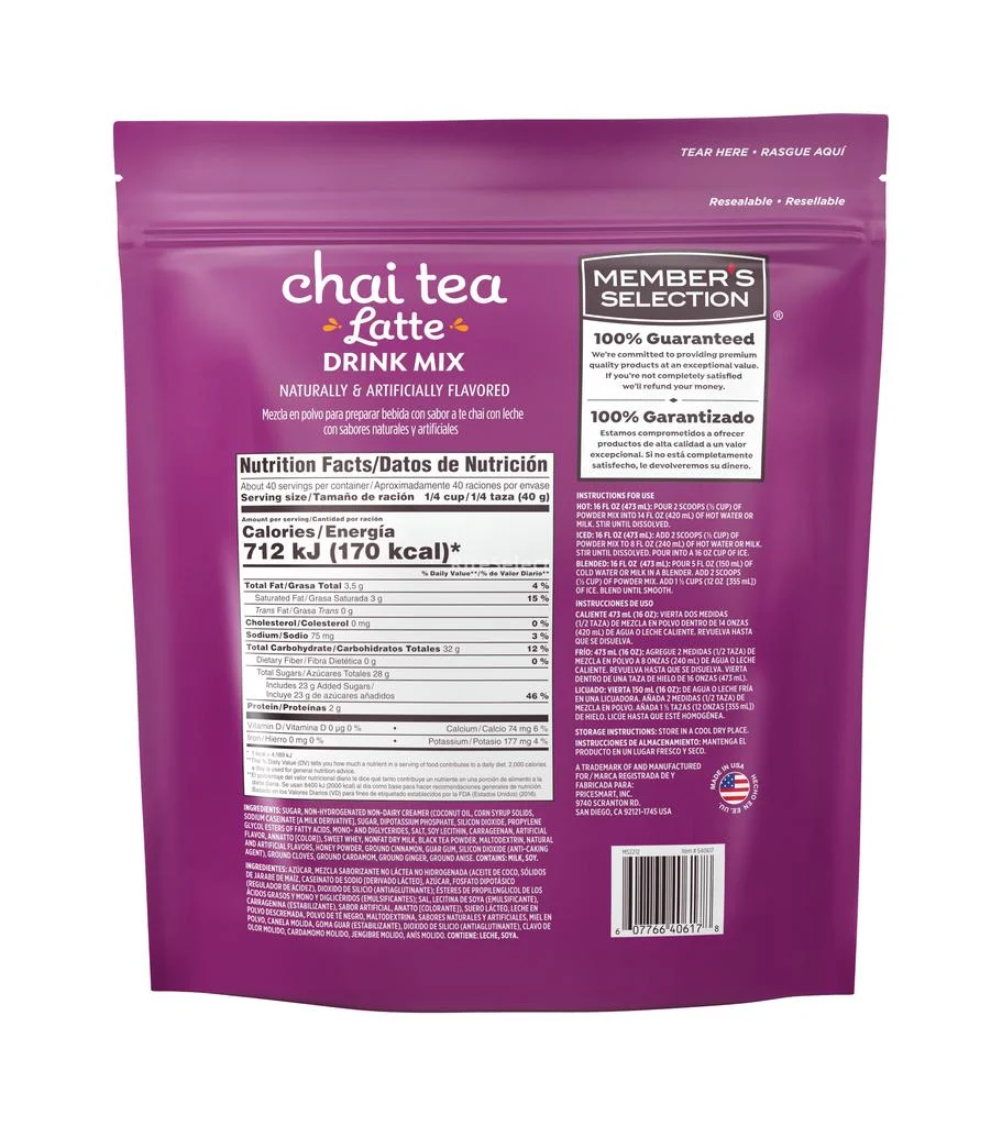 Easily prepare creamy beverages with this chai tea with milk powder mix. It's so delicious you can enjoy it either hot or as a frappe. It comes in a resealable package with a measuring spoon included for easy preparation. Our Member's Selection products are made with premium quality at an exceptional value.