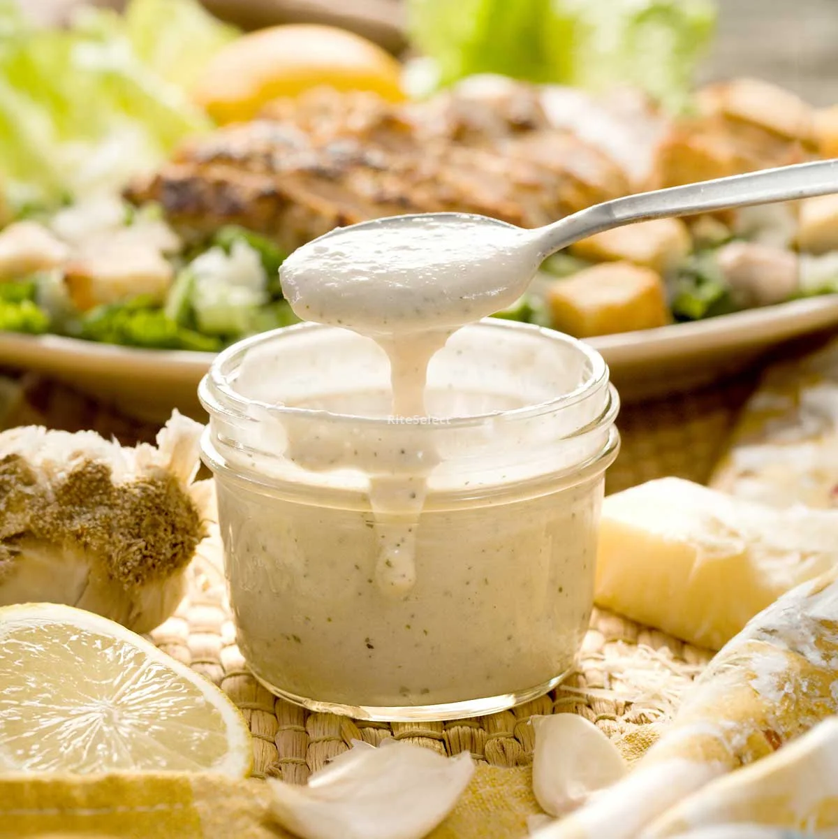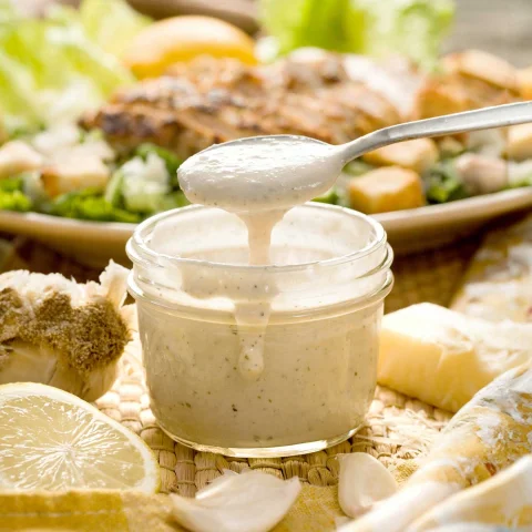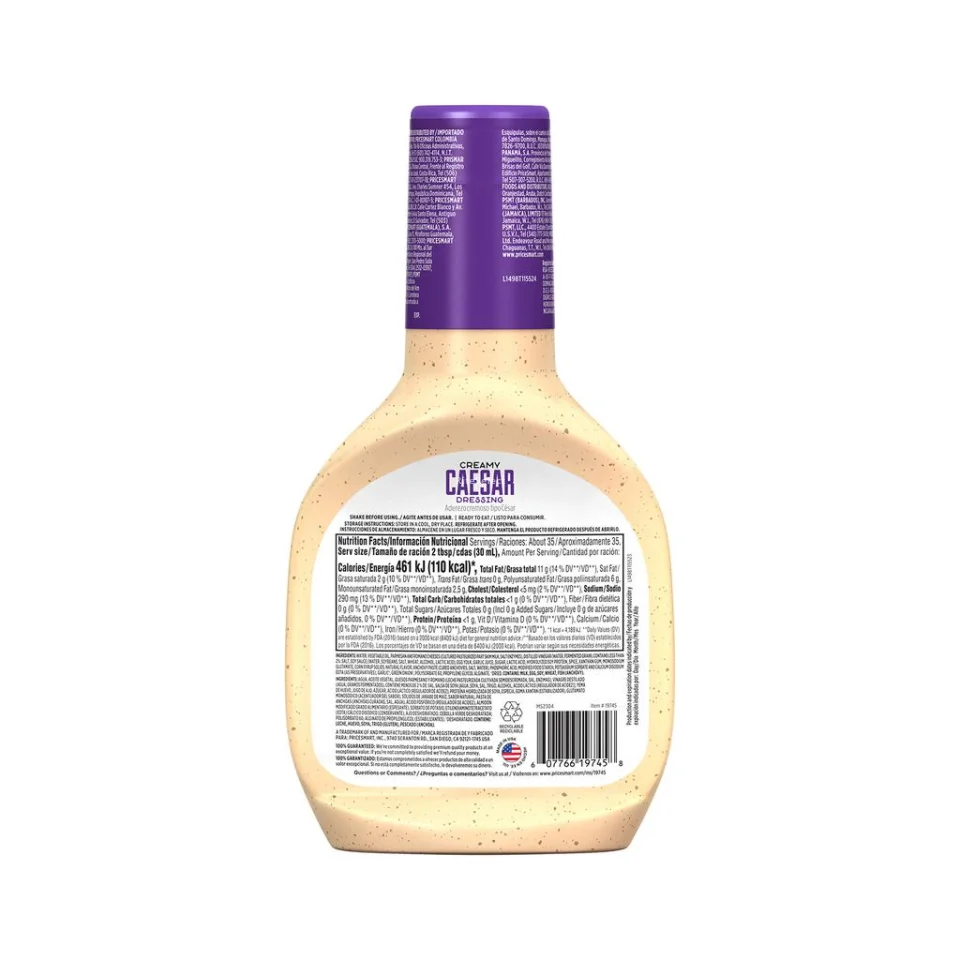 Water, vegetable oil, Parmesan and Romano cheeses (pasteurized cultured semi-skim milk, salt, enzymes), distilled vinegar, (water, fermented grains), contains less than 2% of: salt, soy sauce [water, soy, salt, wheat, alcohol, lactic acid (acidity regulator)], egg yolk, garlic juice, sugar, lactic acid (acidity regulator), hydrolyzed soy protein, spices, xanthan gum (stabilizer), monosodium glutamate (flavor enhancer), corn syrup solids, natural flavor, anchovy paste (cured anchovies, salt, water), phosphoric acid (acidity regulator), modified food grade starch (thickener), potassium sorbate, ethylenediaminotetracetate (EDTA) disodium calcium (preservative), dehydrated garlic, dehydrated green onion; polysorbate 60, propylene glycol alginate (stabilizers). †dehydrated. Contains: milk, egg, soy, wheat (gluten), fish (dehydrated anchovies).