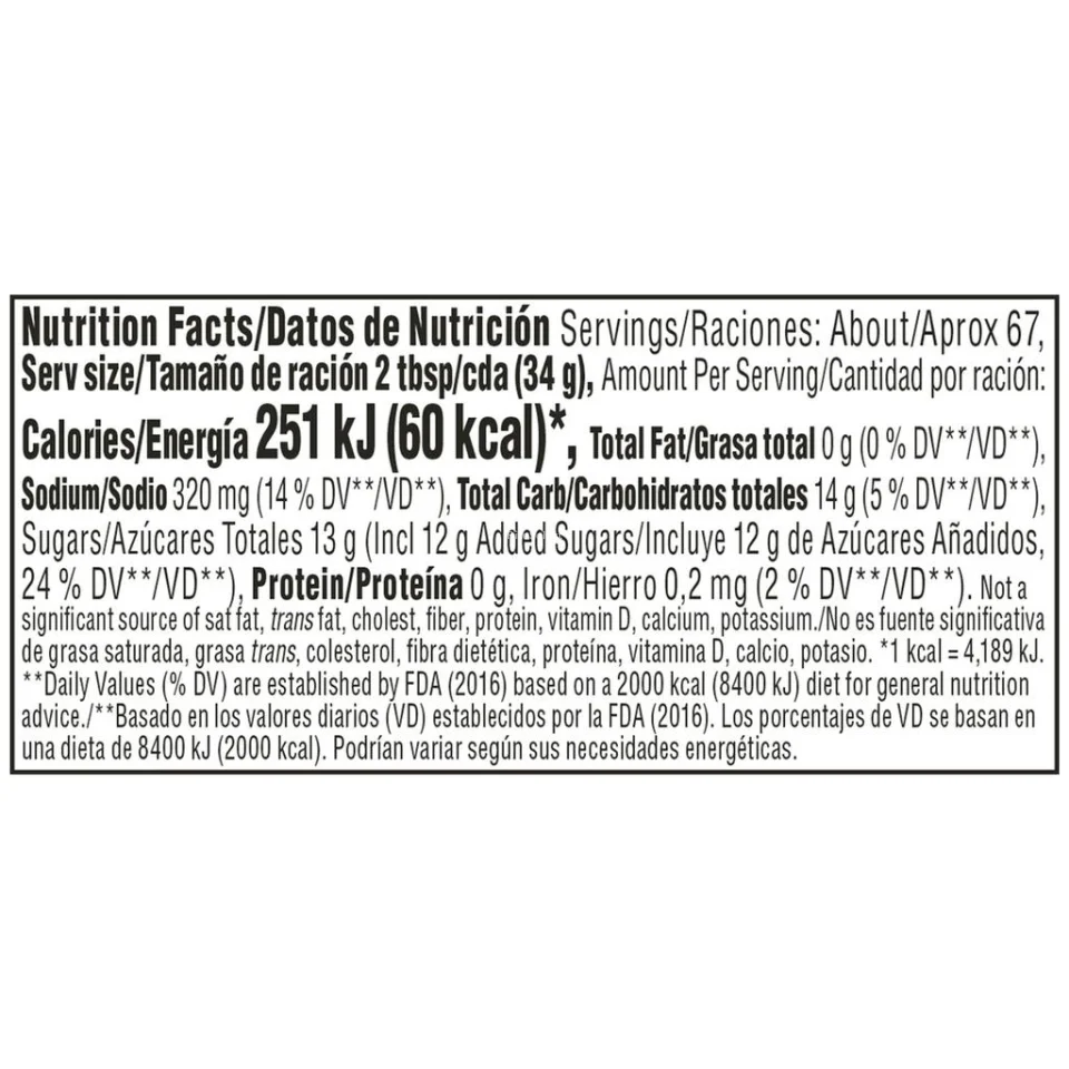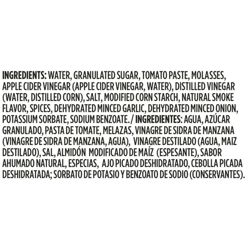 • Water, sugar, granulated, tomato paste, molasses, apple cider vinegar, water, distilled vinegar, salt, starch, modified corn, natural smoking flavor, spice, dehydrated chopped garlic, dehydrated chopped onion, potassium sorbate and sodium benzonate.